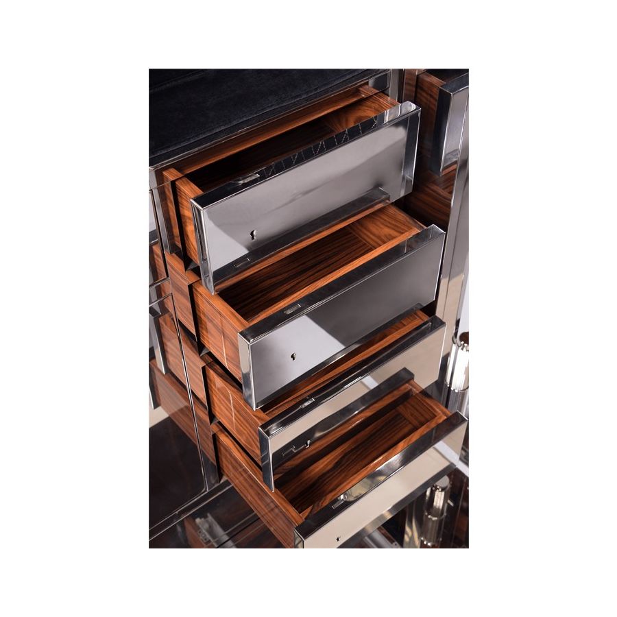Mahogany safe structure, lined with polished stainless steel sheets. Turned brass handles and gold-plated wheels. Its opening system works with a secret code combination. The interior features a set of drawers and a door with a separate locking system.