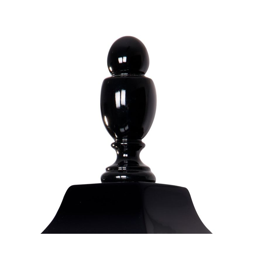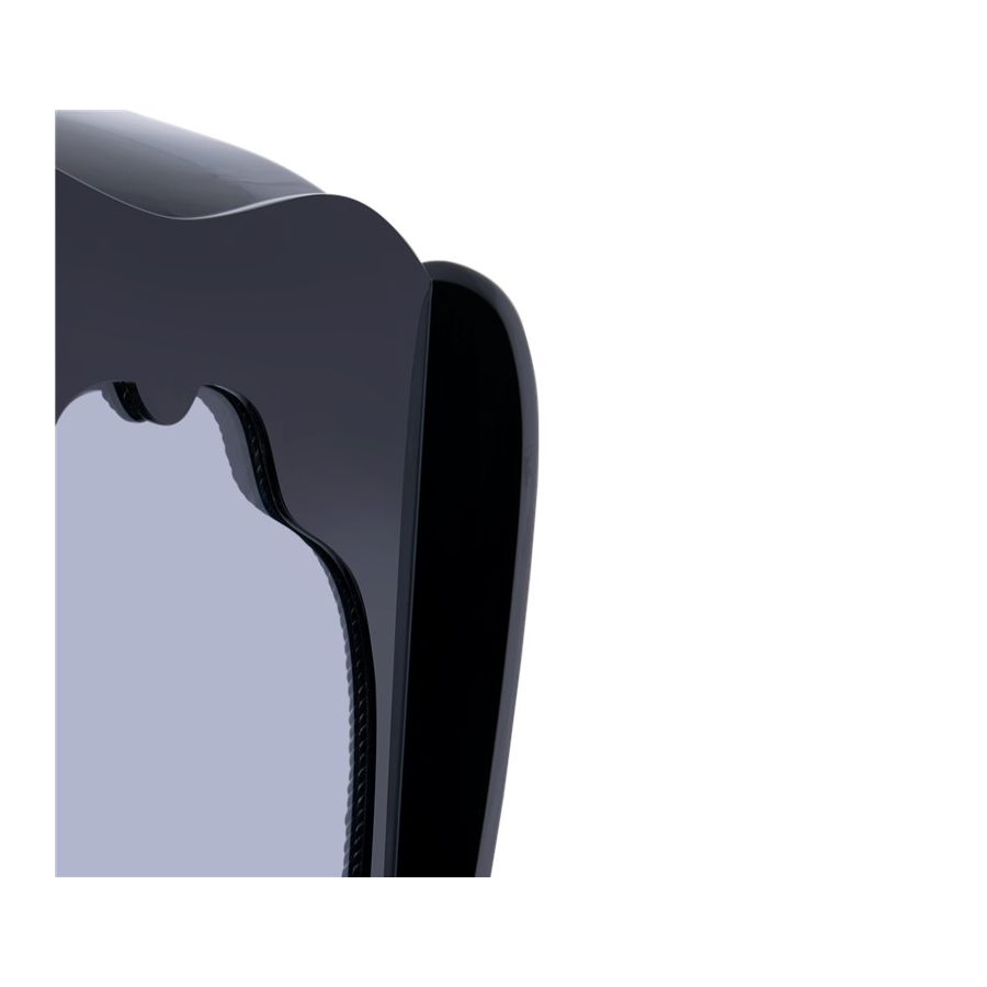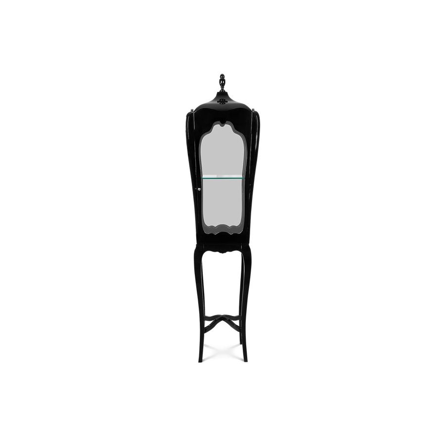 The black detailed frame is handcrafted in mahogany and supports four panels of clear glass. Behind its door that opens through a golden knob and closing switch, the interior boasts a single shelf in tempered glass. A versatile yet timeless case piece to showcase precious objects in different private homes or contract projects, from the most contemporary interior design rooms to the most classic interiors.