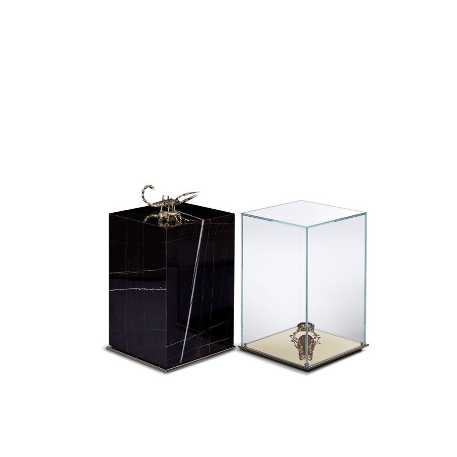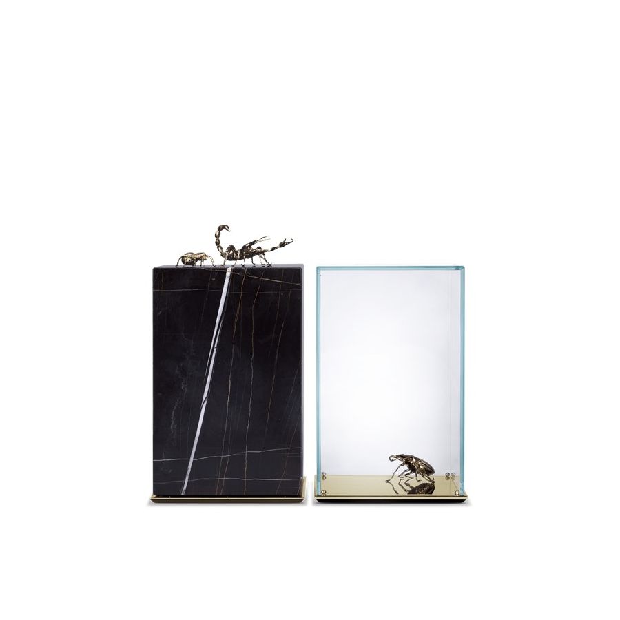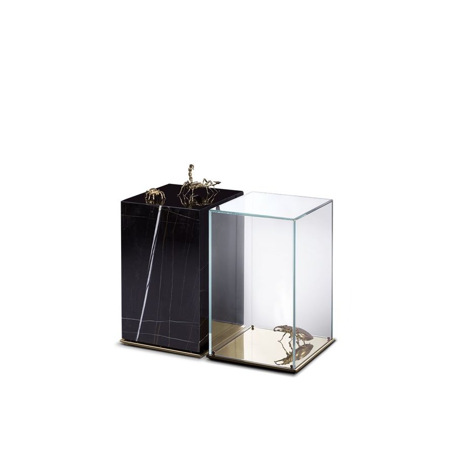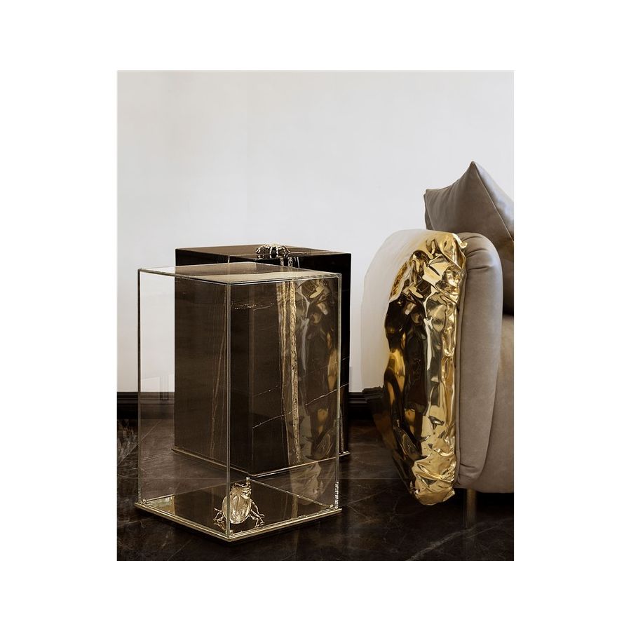 The enormous success of the Metamorphosis Series gave birth yet to another unique creation – Metamorphosis Side Table. Similar to the dramatic transformation and the sudden change in the animal's body structure, Metamorphosis Side Table experiences new unexpected design techniques, noble finishes through a meticulous artistic process. The center table is composed by two fragments, finished in mirror and noble marble and beautified by the presence of golden creatures that are prepared for their ultimate metamorphosis.