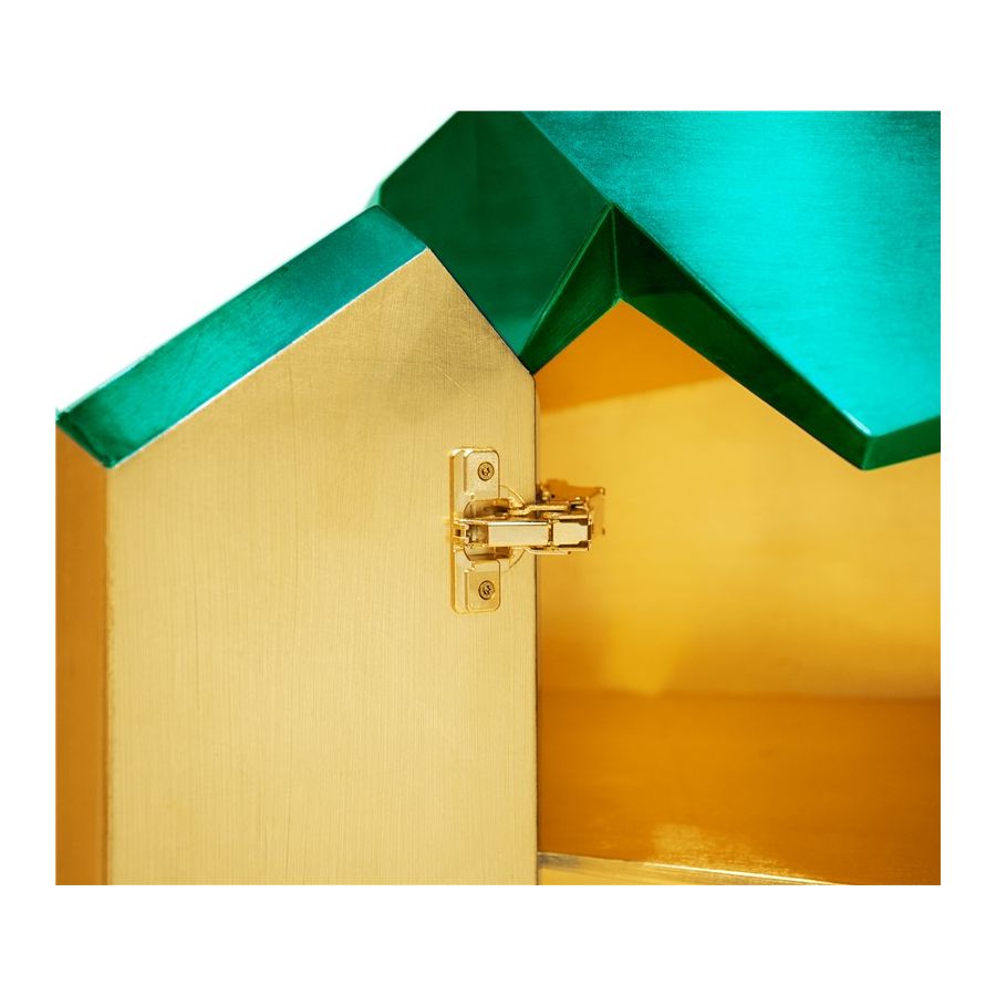 Influenced by deconstructivism movement of postmodern architecture, the contemporary storage sideboard is conceived from wood and covered by silver leaf finished with a distinct translucent shade of emerald and high gloss varnish on top. It features two highly sculpted drawers and two doors, leading to a remarkable gold leaf interior. Layer by layer, leaf gilding is one of the most treasurable and richest crafts techniques. An unexpected way to give a timeless touch and to carry the legacy of those who built it.