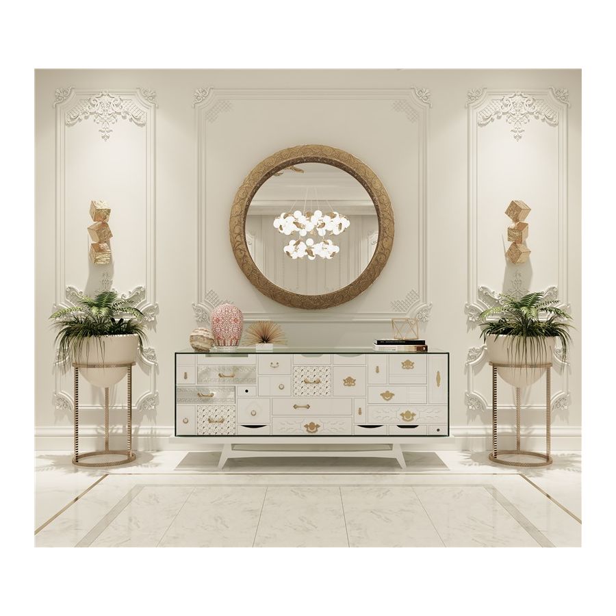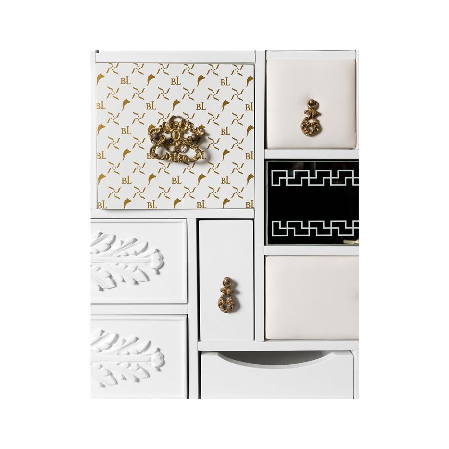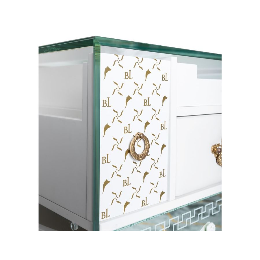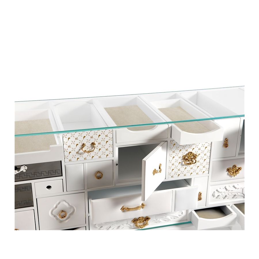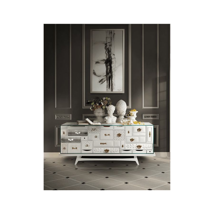 This modern sideboard features a mahogany structure gently involved by an elegant frame of tempered glass. Composed by a set of drawers and doors with different styles, it exhibits from carved details finished in high gloss colored lacquer, mirrors and cut glass, to sophisticated leather details, topped by sleek brass handles with classic shapes and crystals. Quieter hues of white and gold brings sense of la dolce vita, an innate sense of heritage blended with haute couture furniture for a timeless interior design.