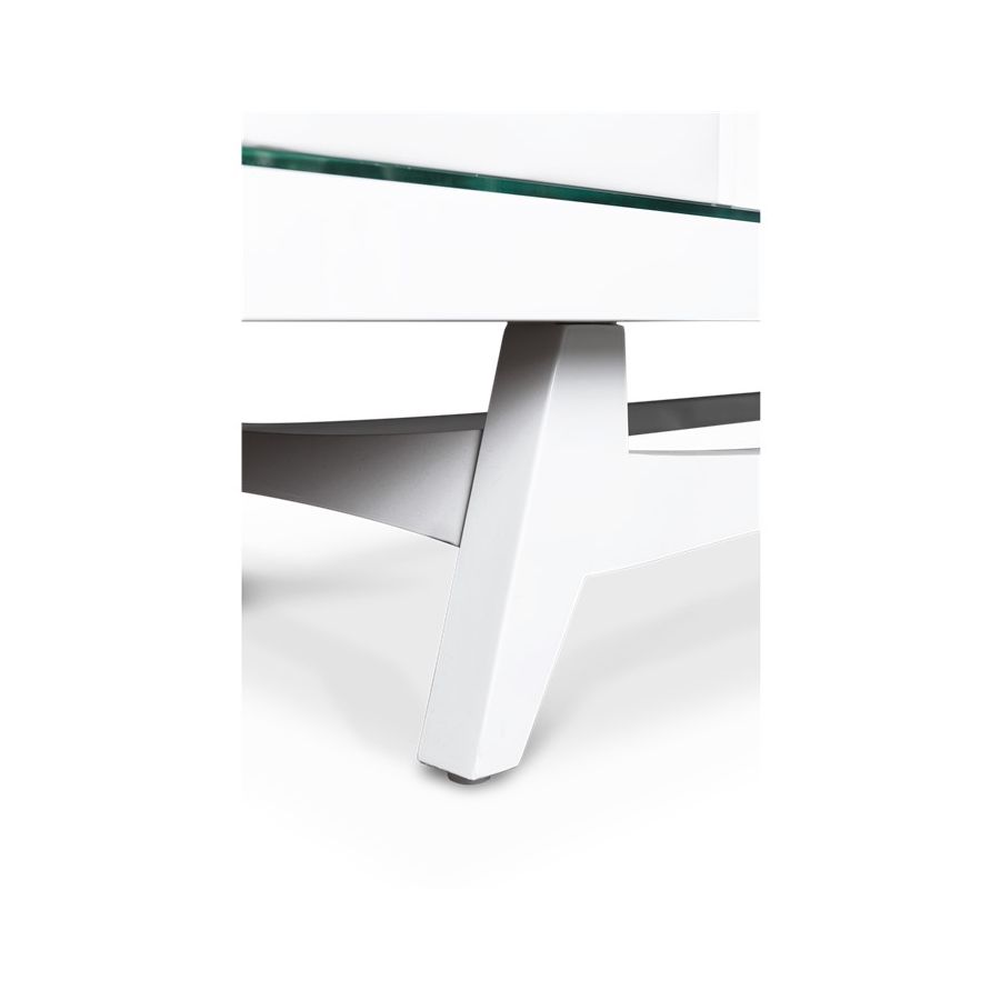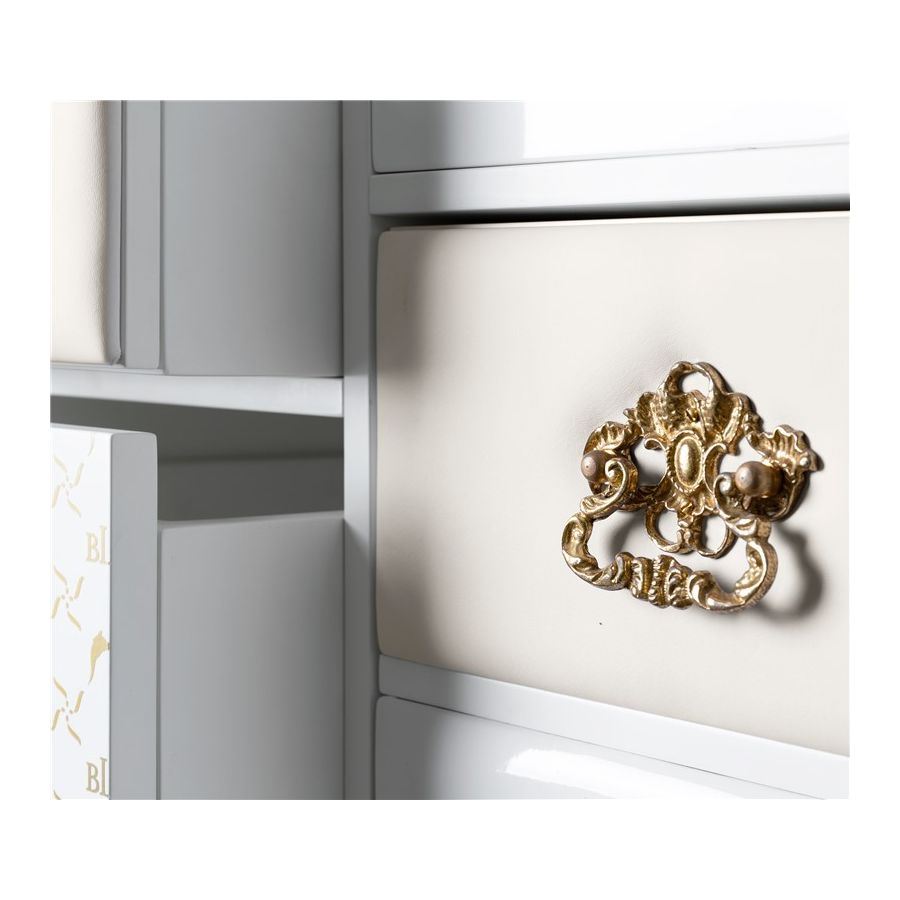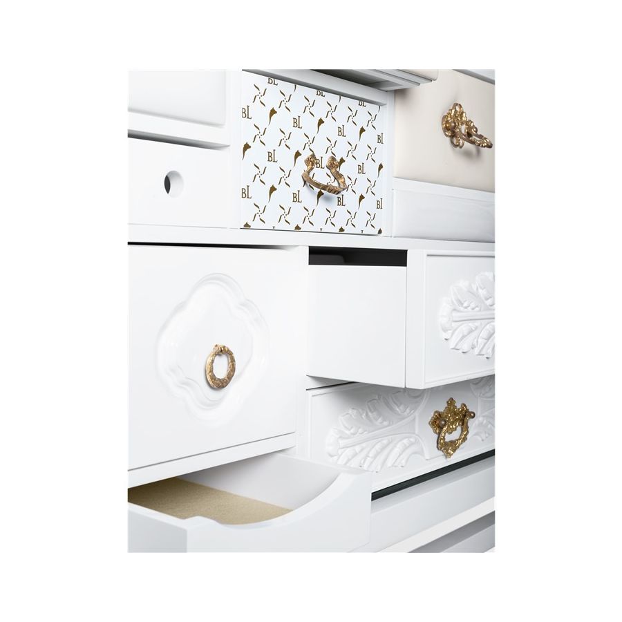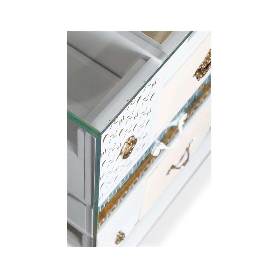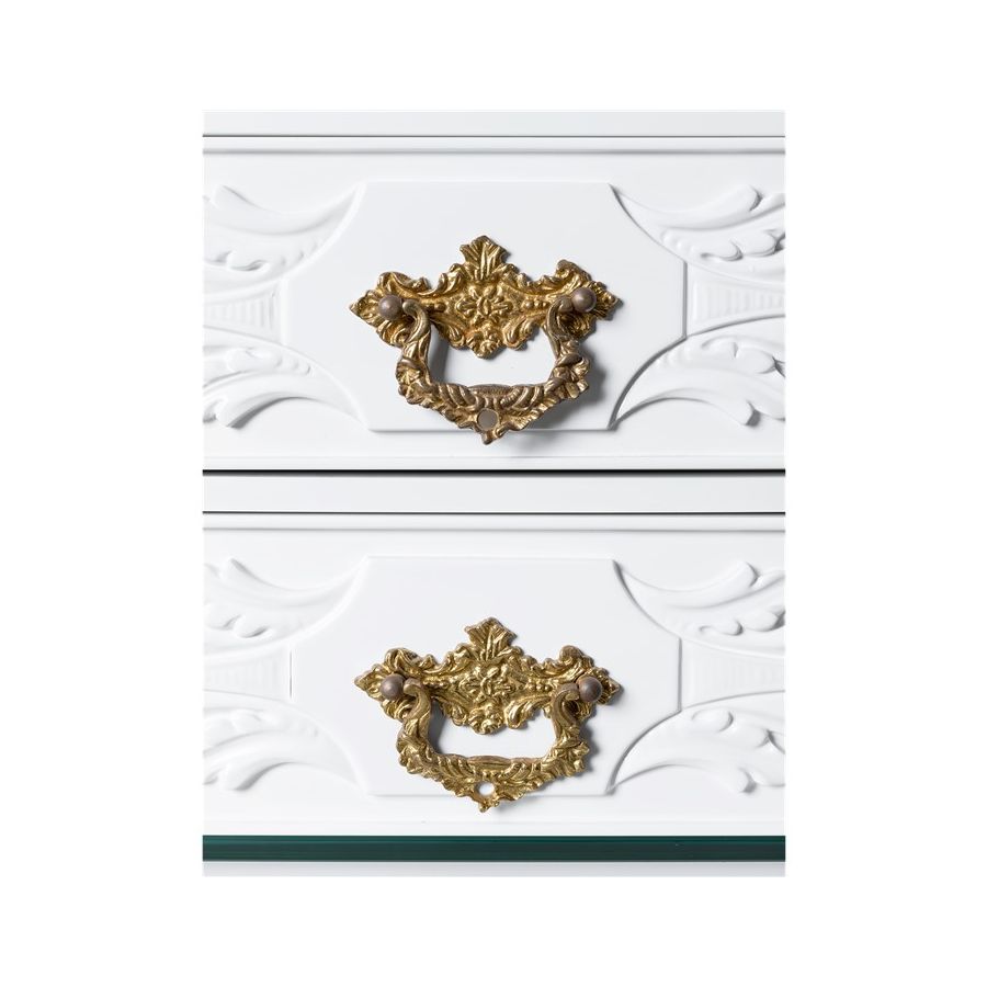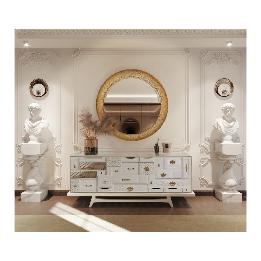 This modern sideboard features a mahogany structure gently involved by an elegant frame of tempered glass. Composed by a set of drawers and doors with different styles, it exhibits from carved details finished in high gloss colored lacquer, mirrors and cut glass, to sophisticated leather details, topped by sleek brass handles with classic shapes and crystals. Quieter hues of white and gold brings sense of la dolce vita, an innate sense of heritage blended with haute couture furniture for a timeless interior design.