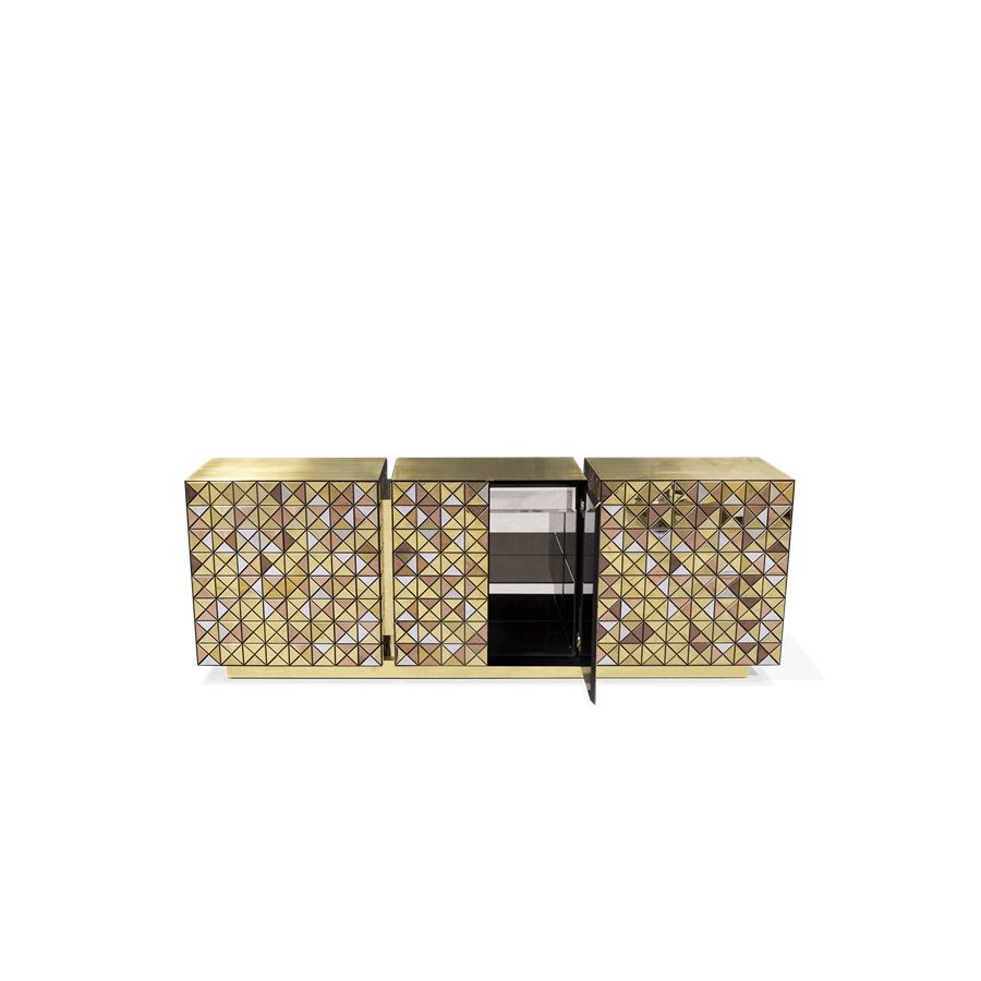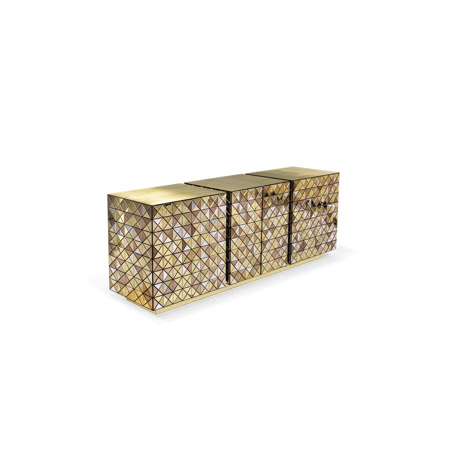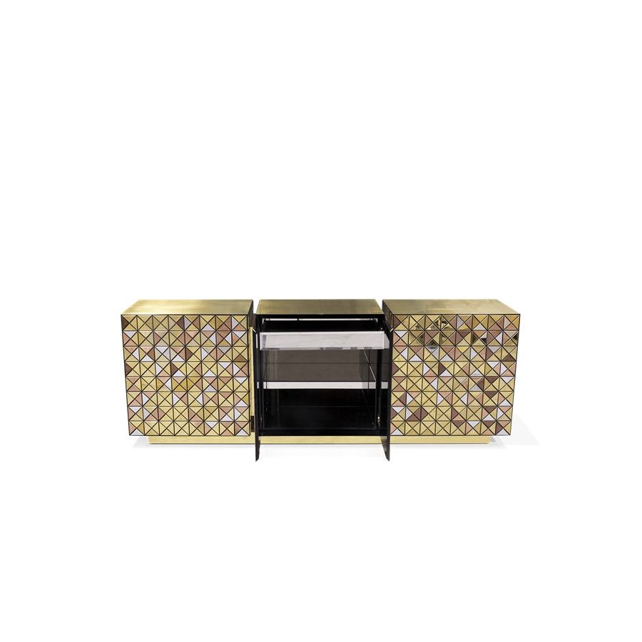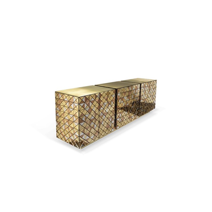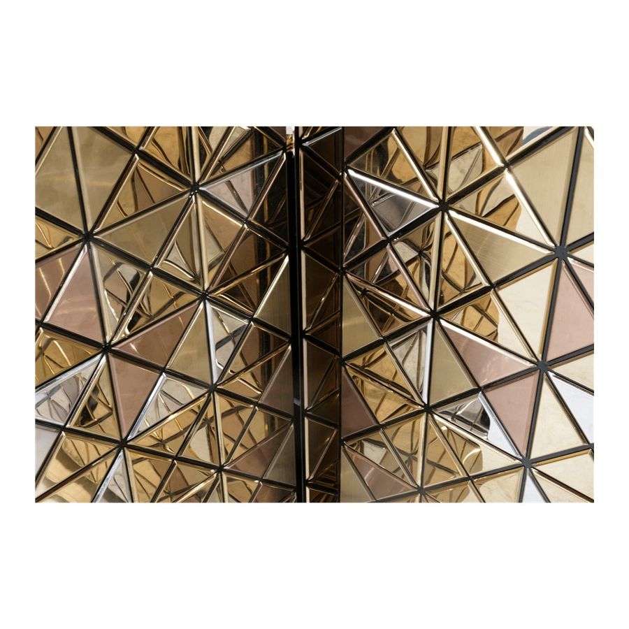 Double-sided sideboard with three doors covered by triangles made from anodized aluminum. Different tones of stainless steel in gold, copper and silver; with brushed and polished finishes.
