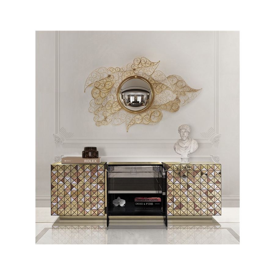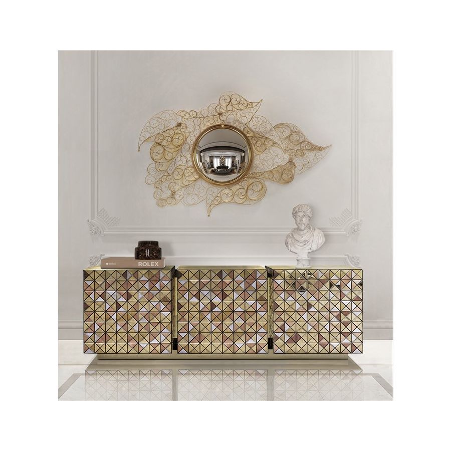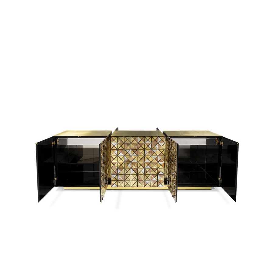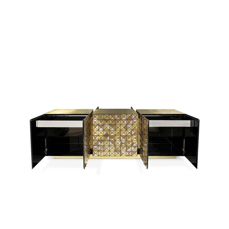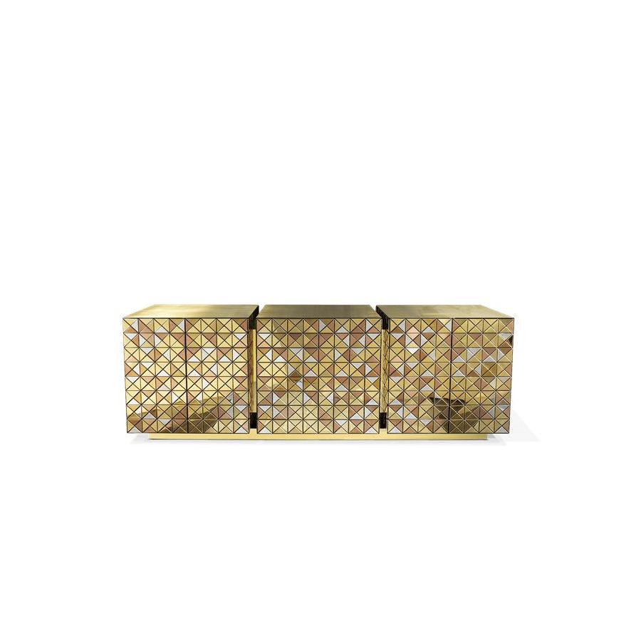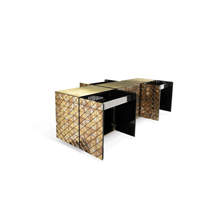 Double-sided sideboard with three doors covered by triangles made from anodized aluminum. Different tones of stainless steel in gold, copper and silver; with brushed and polished finishes.