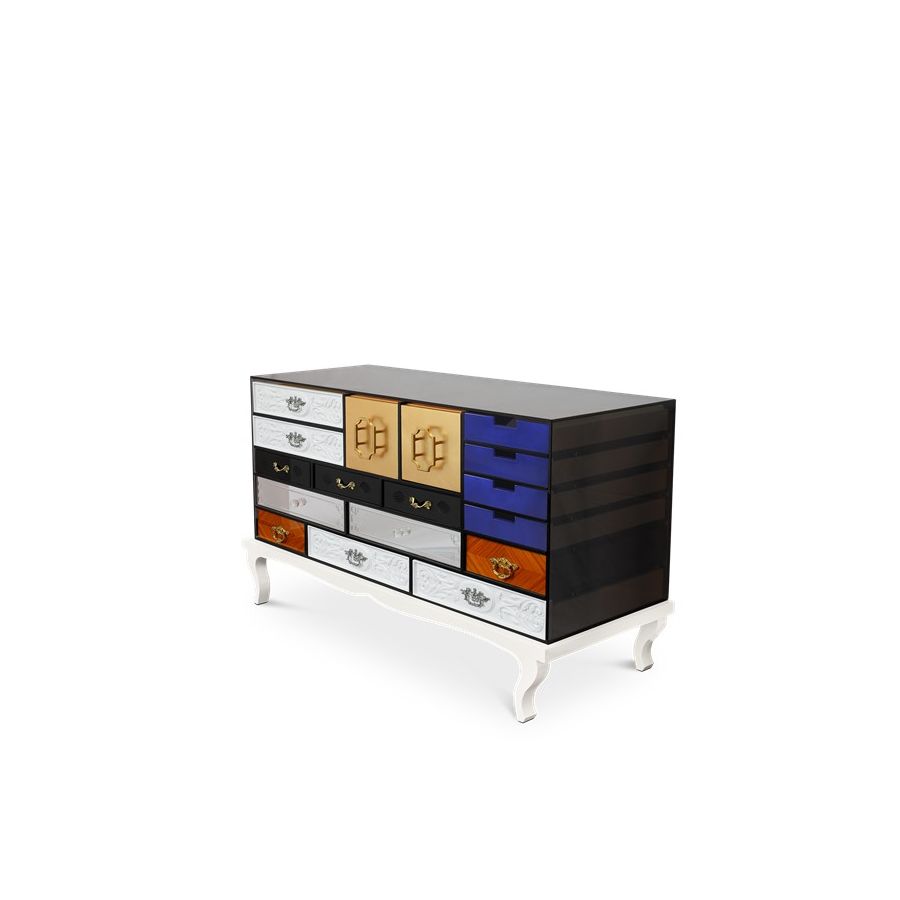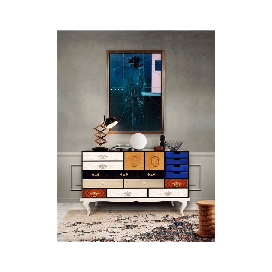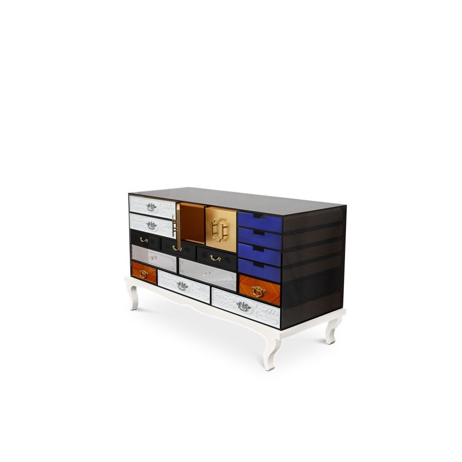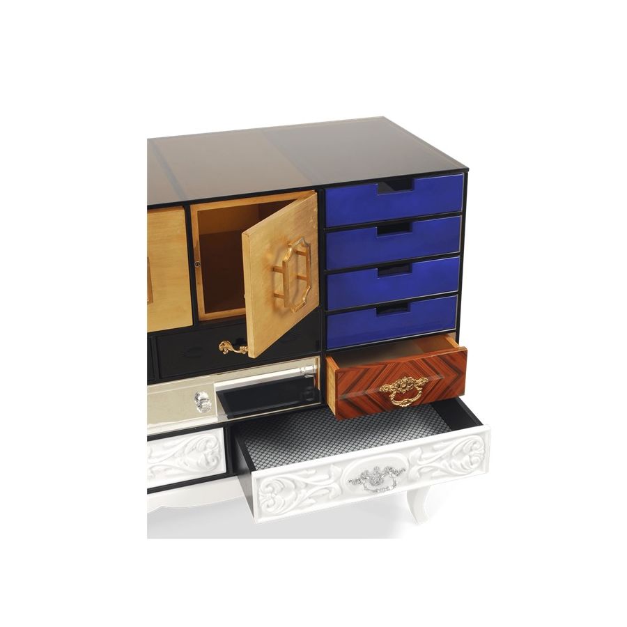 This sideboard bases is made from wood and tempered glass. Composed by 15 drawers and two doors. Its base is made in lacquered wood. It contains drawers with: handcrafted fronts lacquered in white; fronts made by clear mirror and crystal handles; fronts made in maquetry and brass handles; fronts with golden leaf; fronts with black lacquered glass; and fronts lacquered in blue.