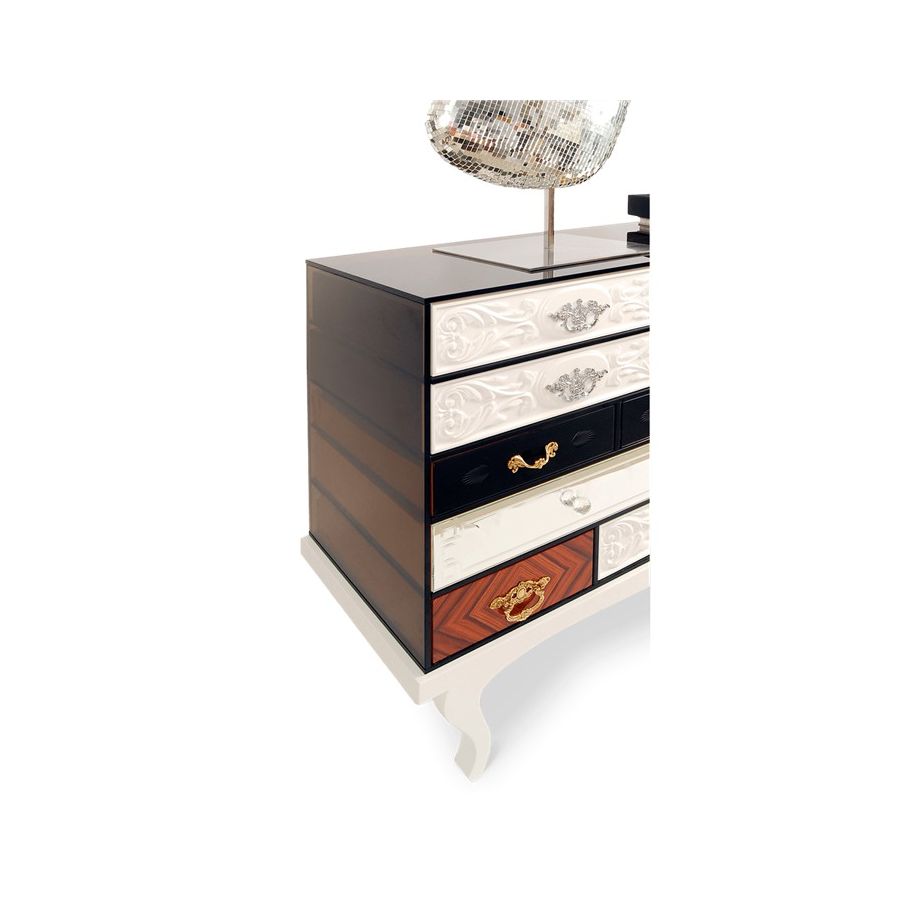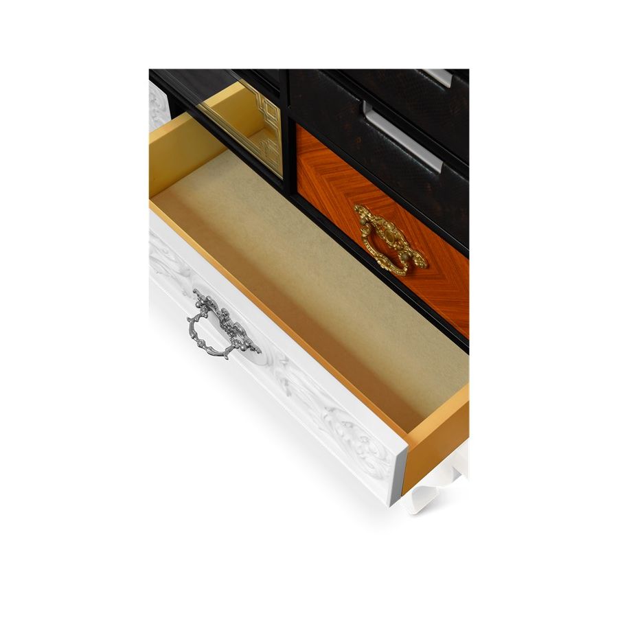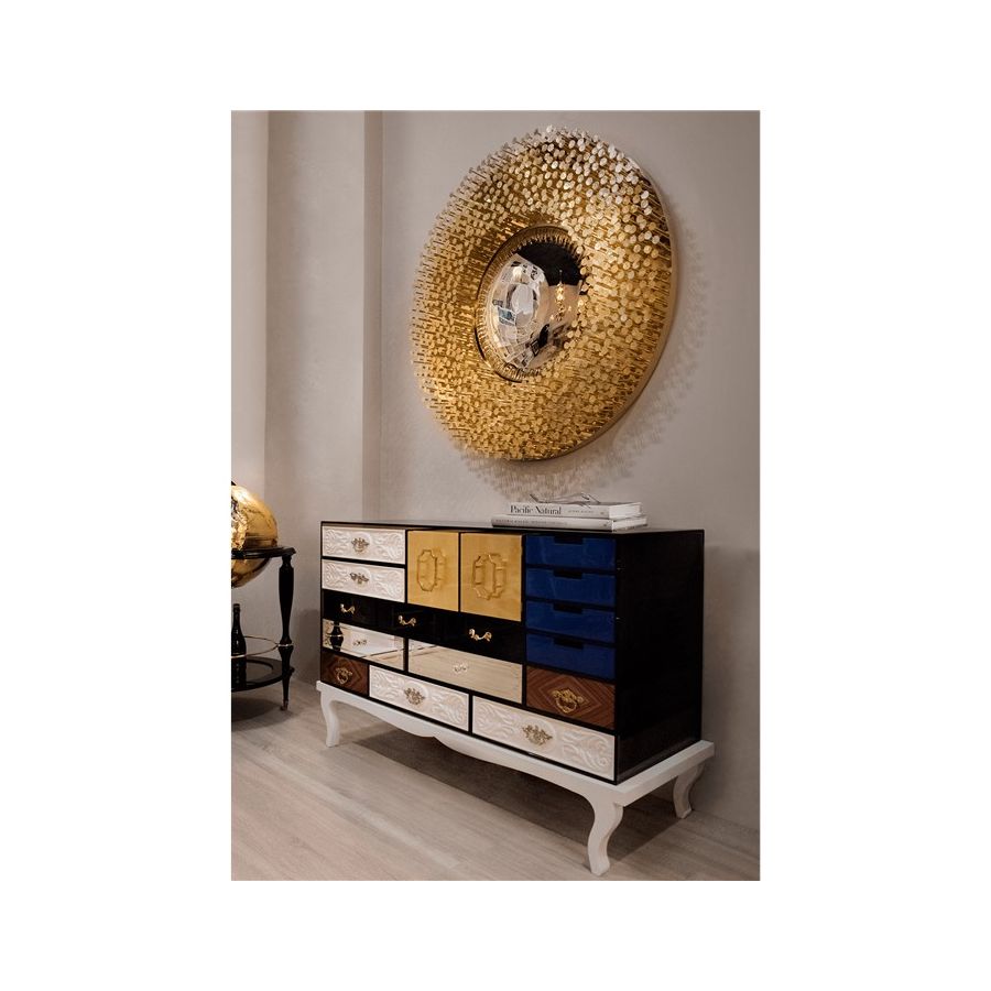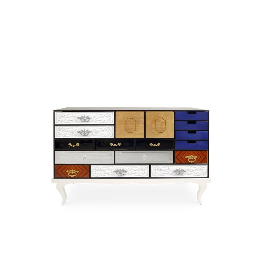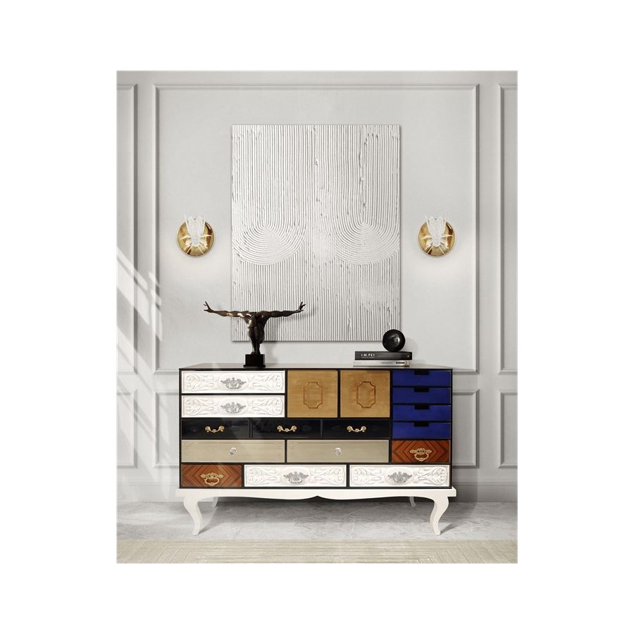 This sideboard bases is made from wood and tempered glass. Composed by 15 drawers and two doors. Its base is made in lacquered wood. It contains drawers with: handcrafted fronts lacquered in white; fronts made by clear mirror and crystal handles; fronts made in maquetry and brass handles; fronts with golden leaf; fronts with black lacquered glass; and fronts lacquered in blue.