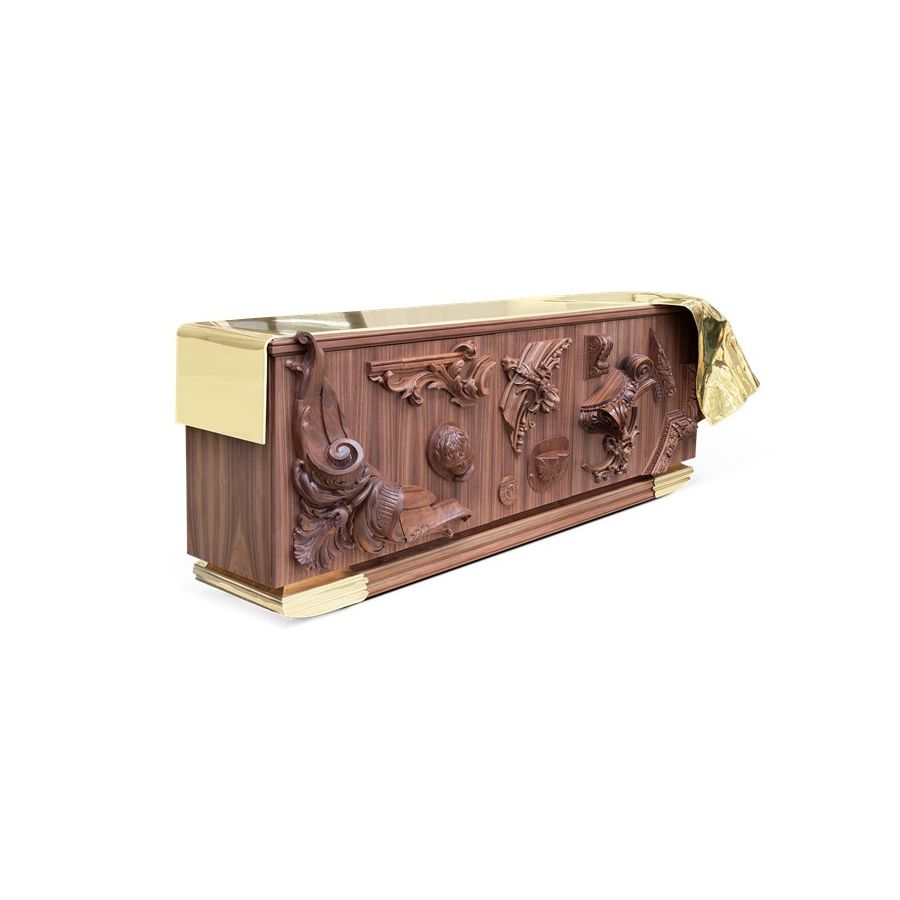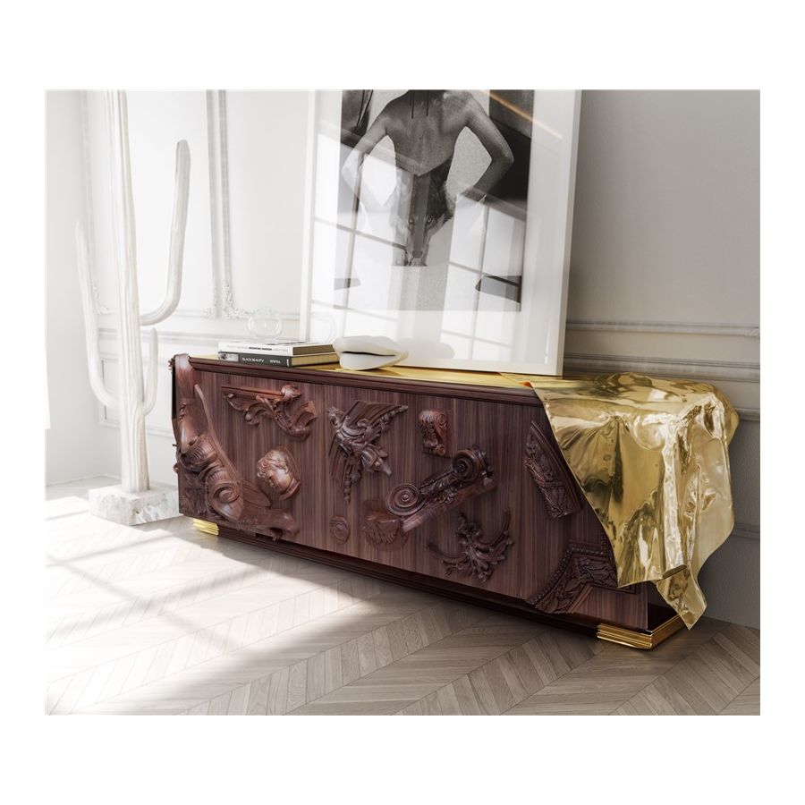 The statement sideboard was conceived to enrich any living space, a masterpiece that carries centuries of history and finest craftsmanship into a contemporary design. Inspired by the French Court’s greatness and splendour of the XVII century, it depicts the architectural and artistic landmarks of the age, alongside, it pays tribute to an era of great thinkers. Known for his ideals of a free and liberal society, Voltaire has become synonymous with the ‘Enlightenment’ due to the philosopher's extraordinary wit, and his deist beliefs, not by faith, but rather by reason.