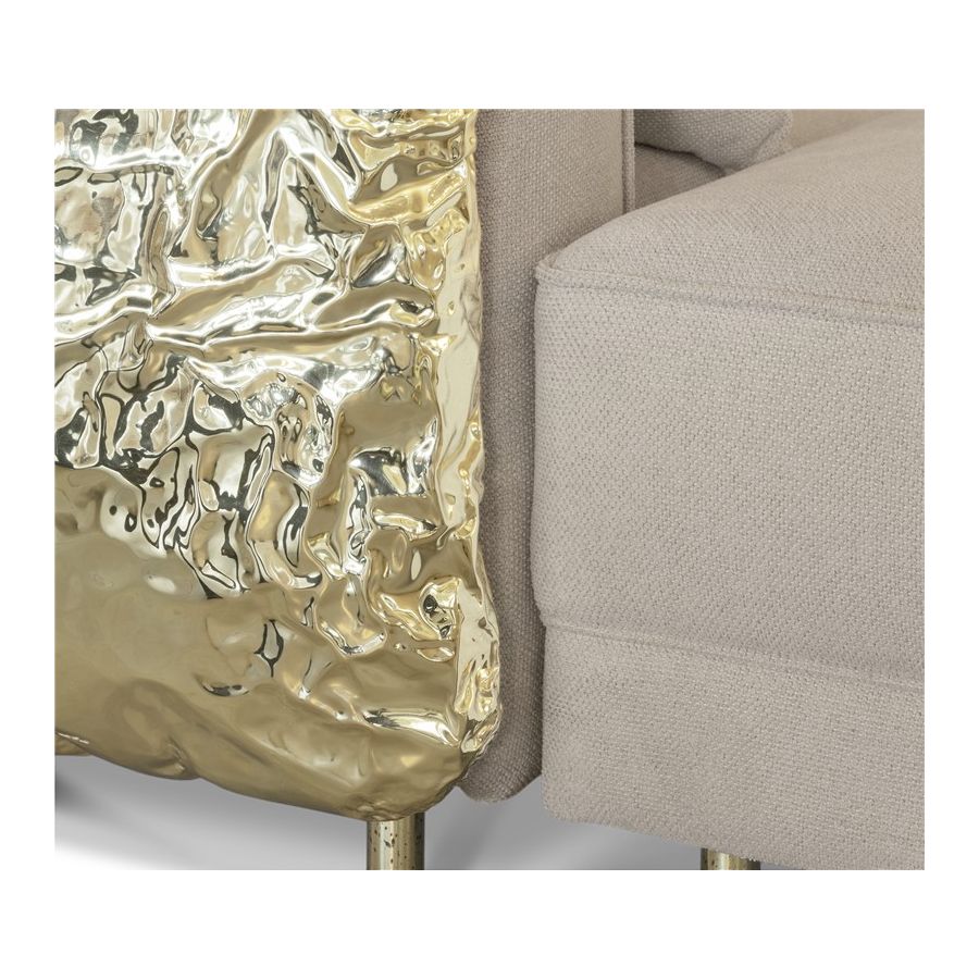 Imperfectio modular sofa is composed of a linear L-shaped sofa paired with upholstered ottoman. The solid wood structure is enveloped by irregular polished brass, founded on elegant slim brass feet. Available in wide selection of natural and bright colors.