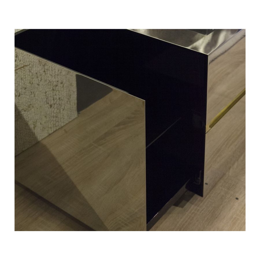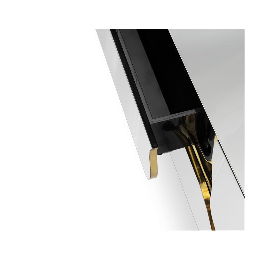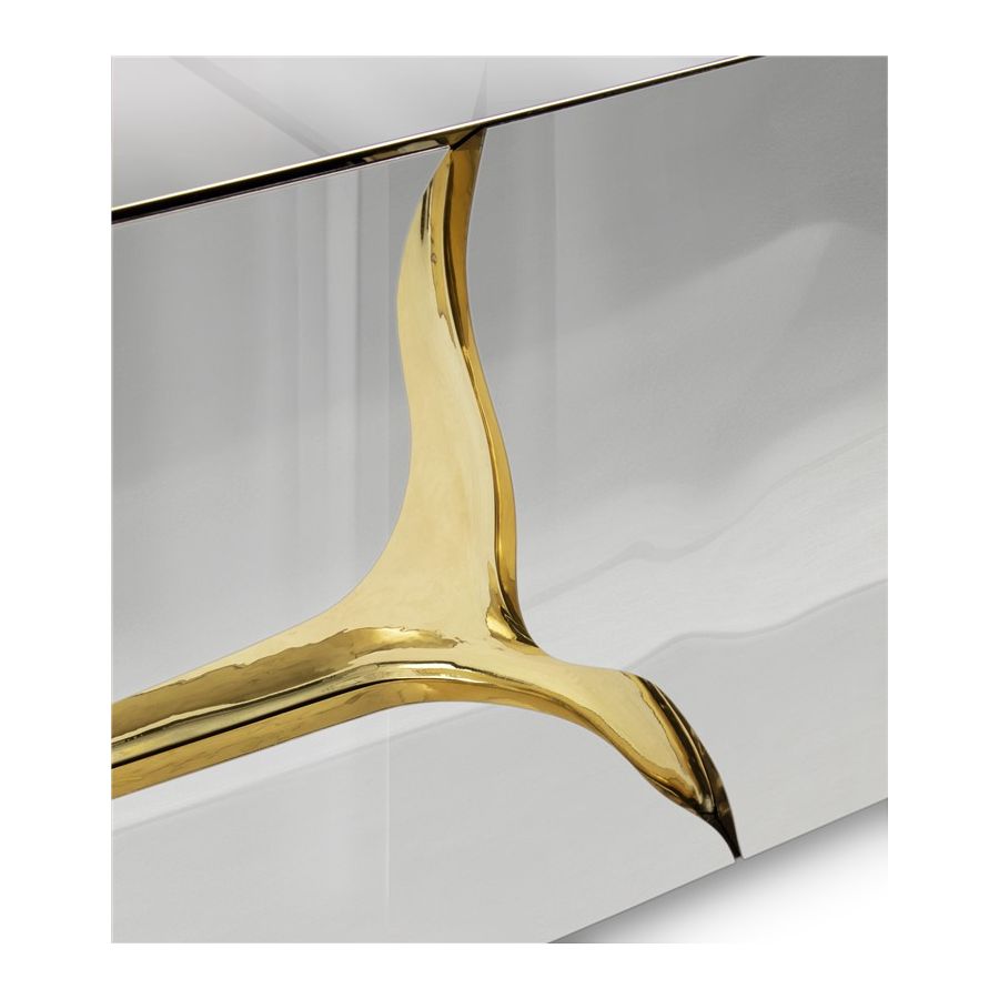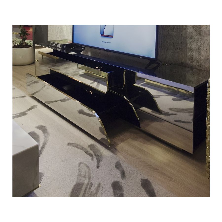 Lapiaz TV cabinet takes exceptional craftsmanship and design to a new realm. Finding beauty in the most unexpected places, this contemporary design piece is inspired by authentic karst formations created by surface dissolution, freezing, or thawing of limestone or dolomite rocks. Its organic features are achieved through the manual fitting of polished brass, and a sharp finish in polished stainless steel that portrays a perfect mirror. It is composed of two modules that open to a distinct black interior, featuring different-shaped drawers and glass shelves. The hammered gold details and the mirrored façade conveys both dynamics and elegance, a beautiful duality between power and refinement to bring a new contemporary verve into interior design. A functional artwork piece born from cold and freshly cracked to show off the world rich, golden details.