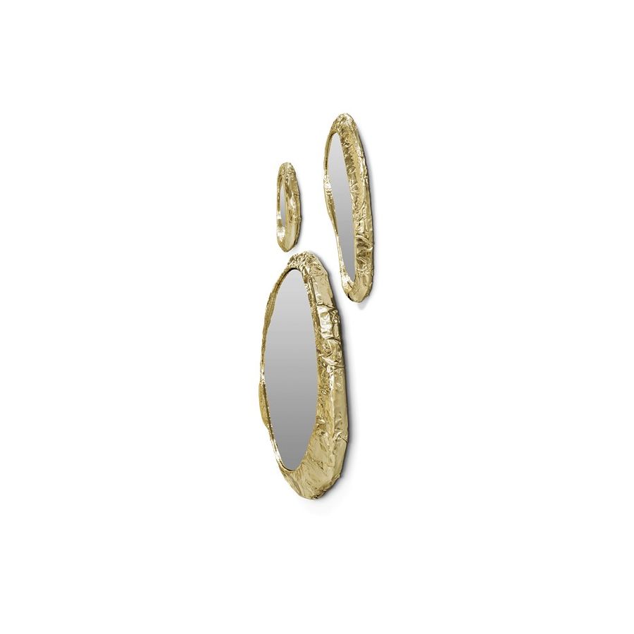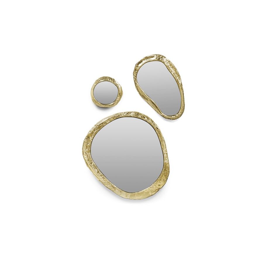A modern set design composed of three different-size mirrors, with polished hammered brass frames.