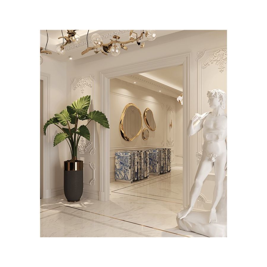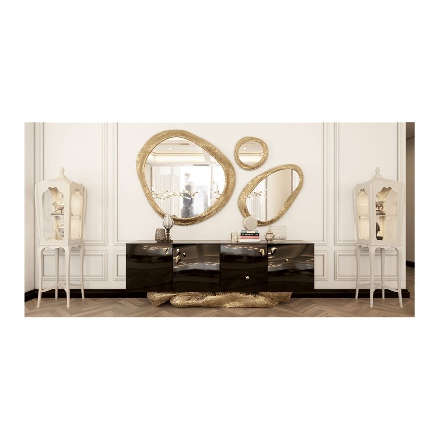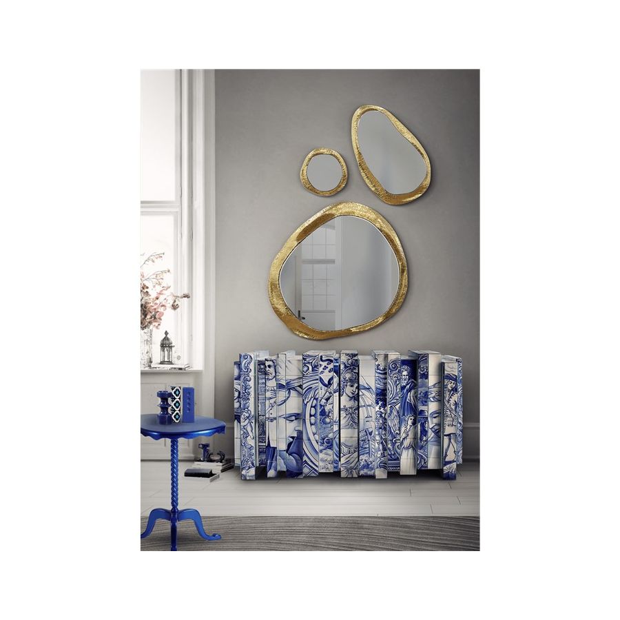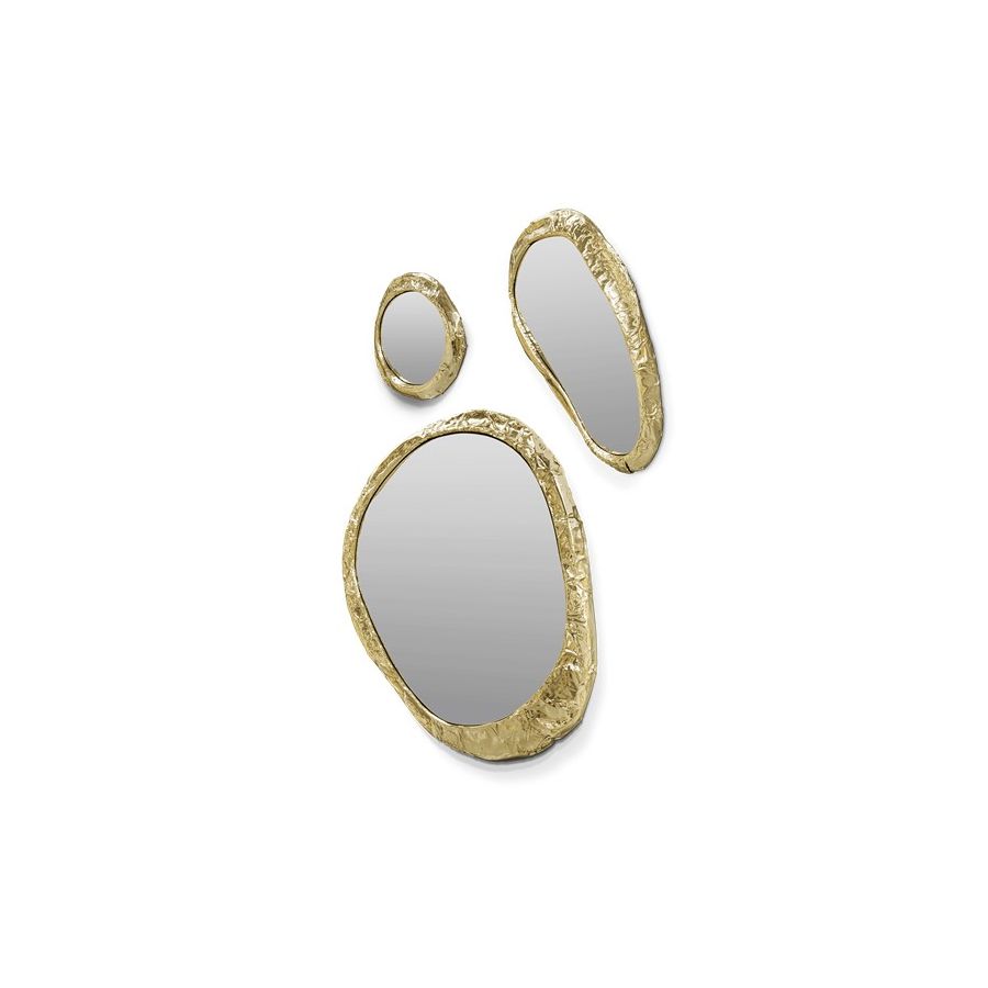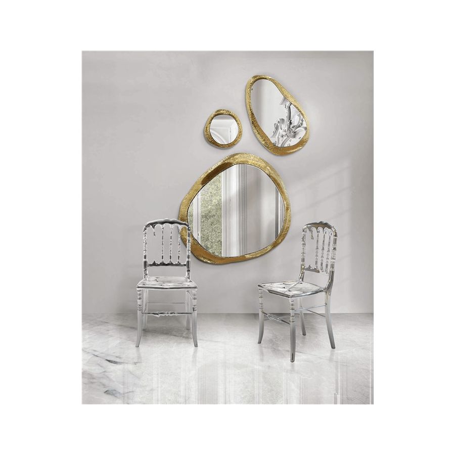 Composed by a set of three mirrors, it allows different displays and creative settings. The big mirrors with different shapes have an elegant gold frame accent, perfect for contemporary interiors and elegant rooms, from stylish bedrooms to upscale halls or living rooms.