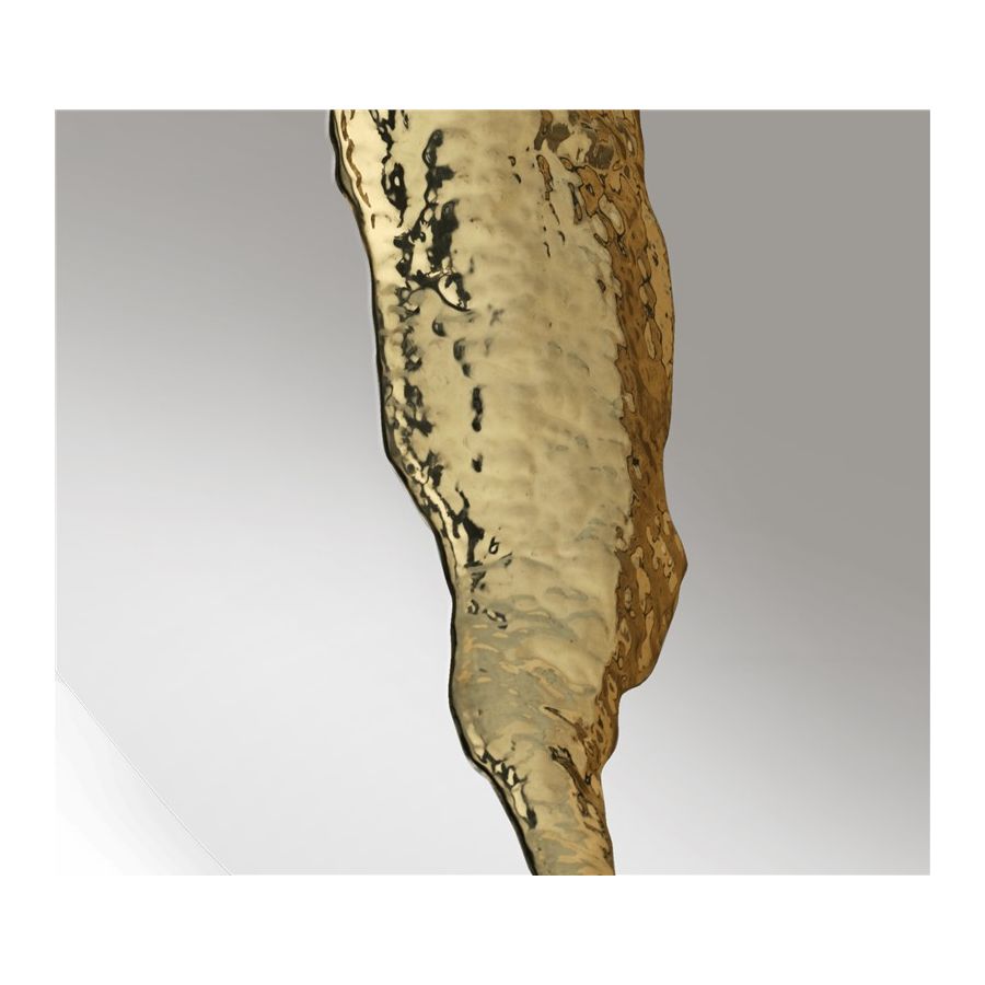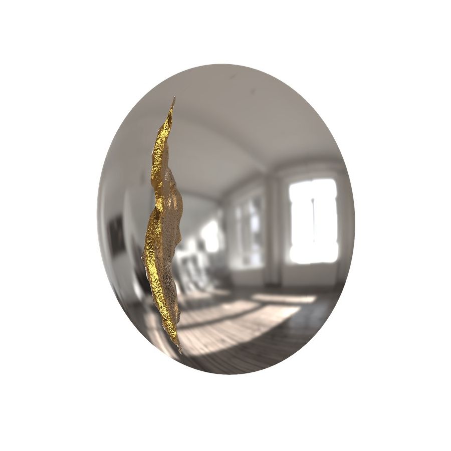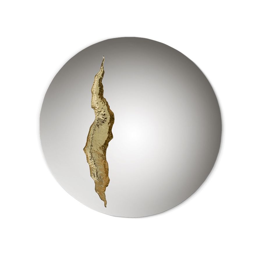 The organic features of this large mirror are achieved through the manual fitting of golden polished brass, finishes in polished stainless steel. The hammered gold details and the mirrored façade conveys a beautiful duality between power and refinement to bring a new contemporary verve into interior design. A functional artwork piece born from cold and freshly cracked to showing off the world rich, golden details.