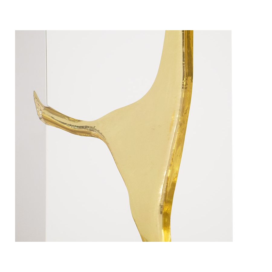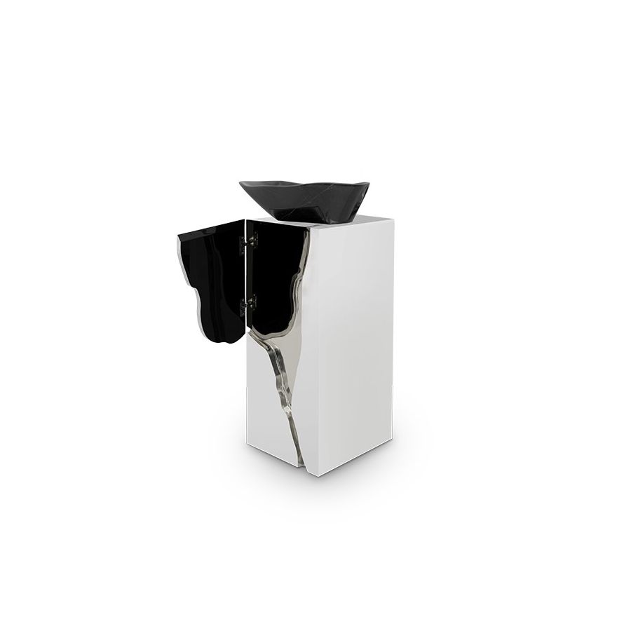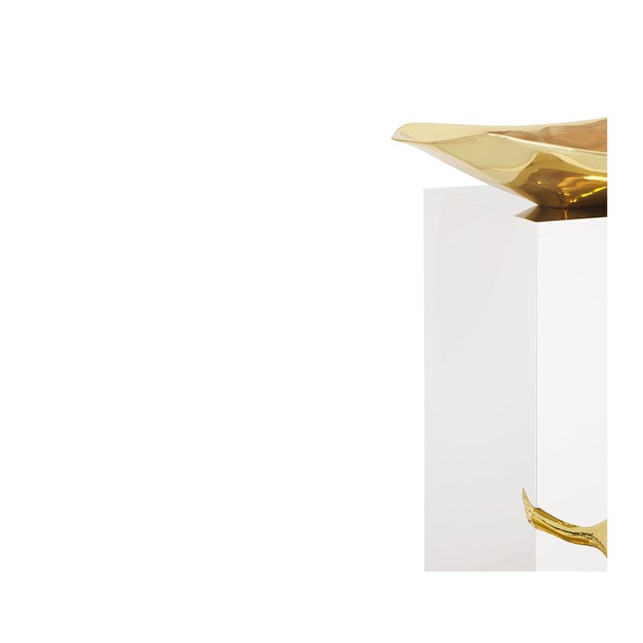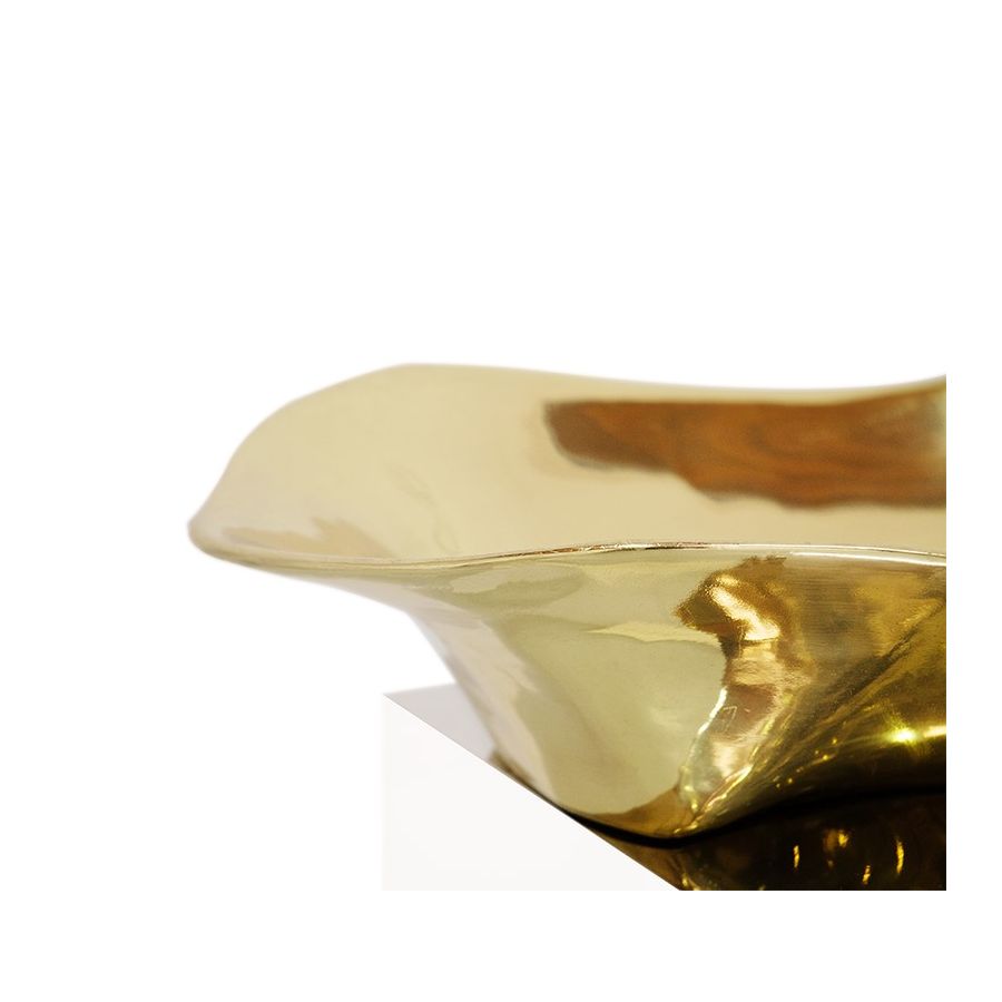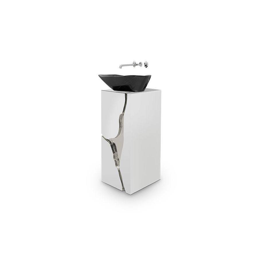 The french word is the name given to the typical karst formations produced by surface dissolution of limestone or dolomite rocks. It can also be caused by freezing and thawing in cold climates. This is how Lapiaz washbasin emerged. Imagine a stone freezed and freshly cracked to show the entire world a rich, golden interior. The polished brass details and mirrored sides attribute this luxury design artwork an artic yet comfy and warm beauty. A real statement piece for the most luxurious bathrooms.