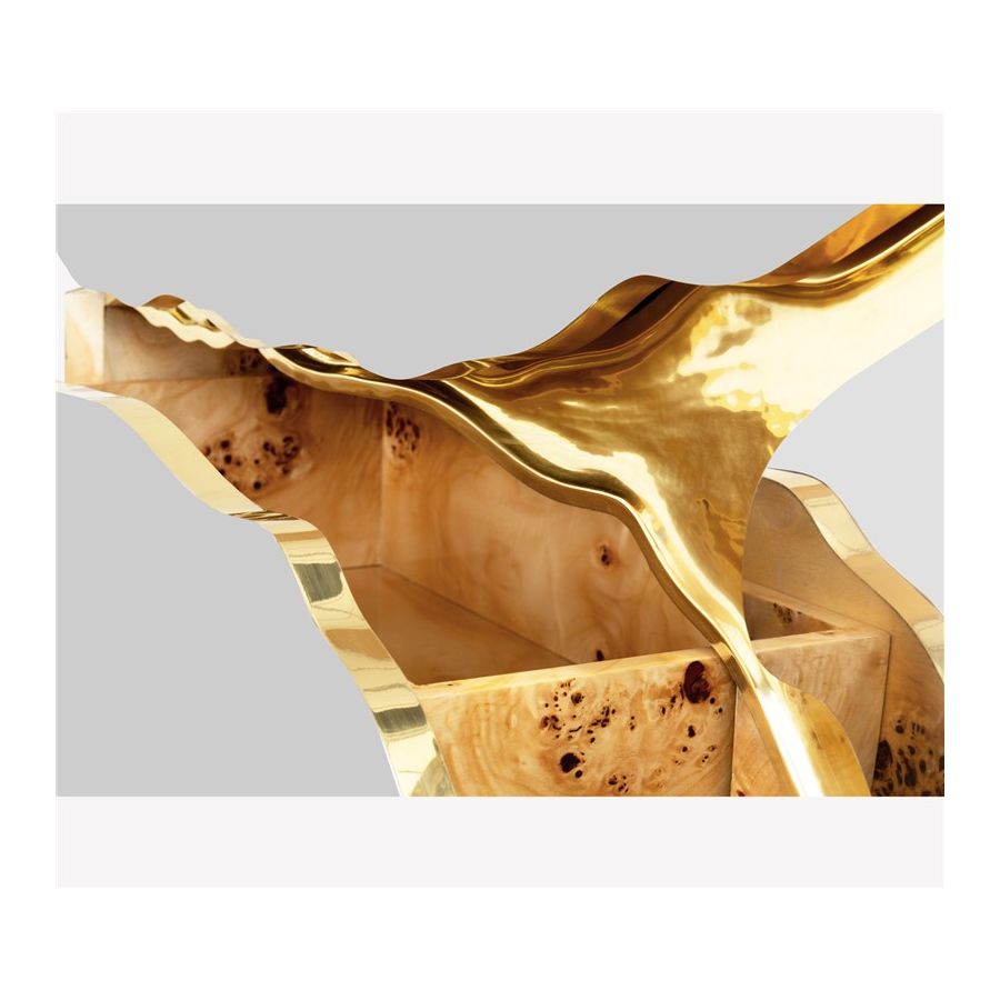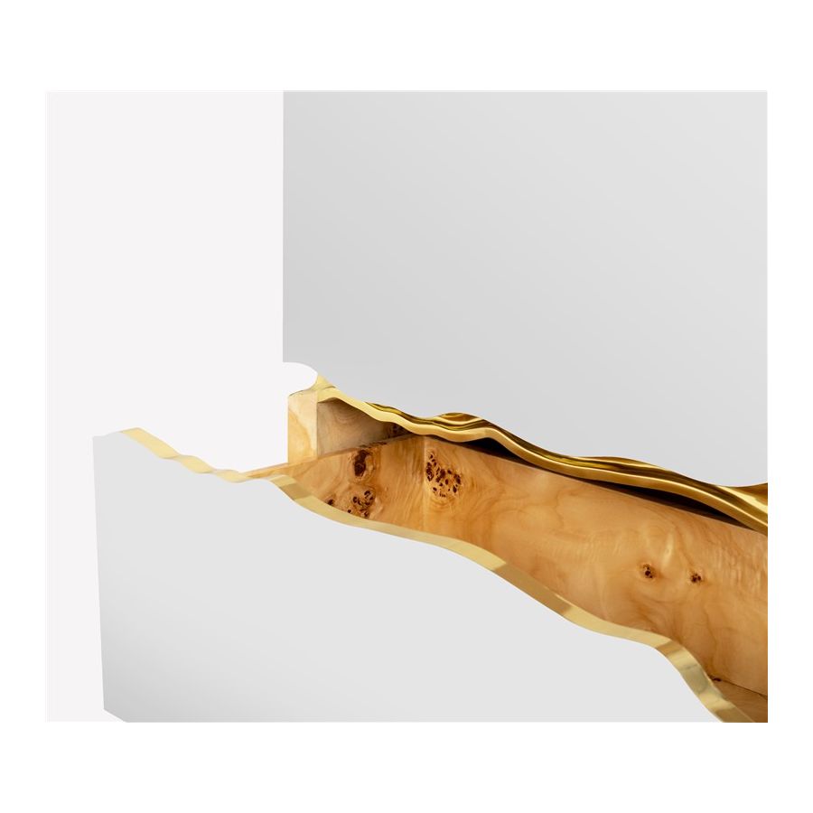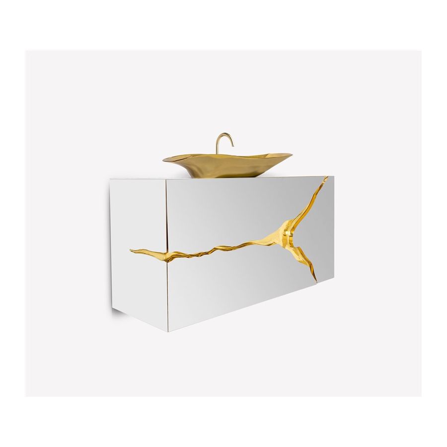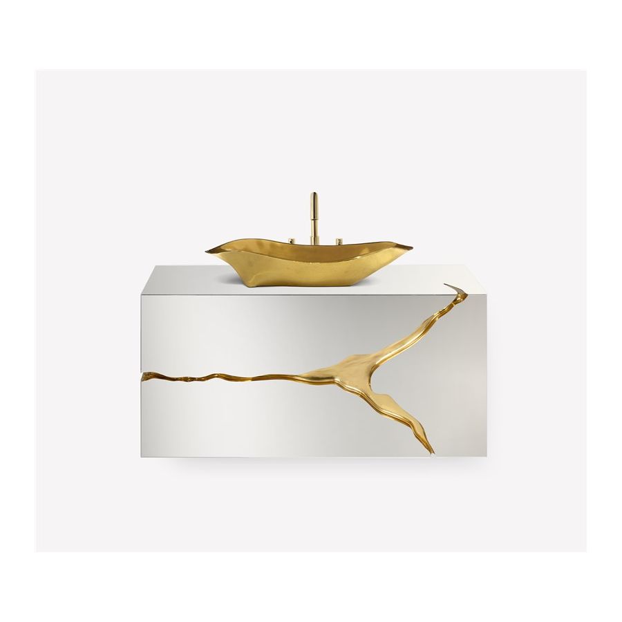 Lapiaz was inspired by the typical karst formations produced by the dissolution of limestone rocks. With a polished brass tear enhanced by its rich aesthetic as well as a set of one door and two drawers finished in poplar root veneer, this Lapiaz Single Vanity Cabinet is such a statement that stands out in your bathroom interior design.