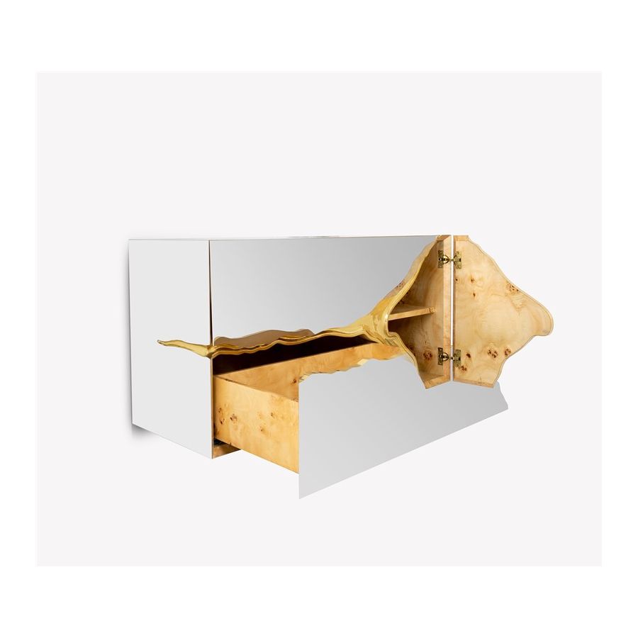Structure: high gloss black lacquered wood, Coated with a sheet of stainless steel | Polished brass tears, High gloss varnish; Inside: Poplar Root Veneer; One Drawer and Two Doors; Water drainage: Wall