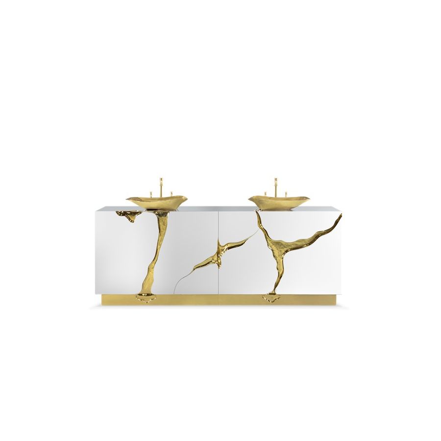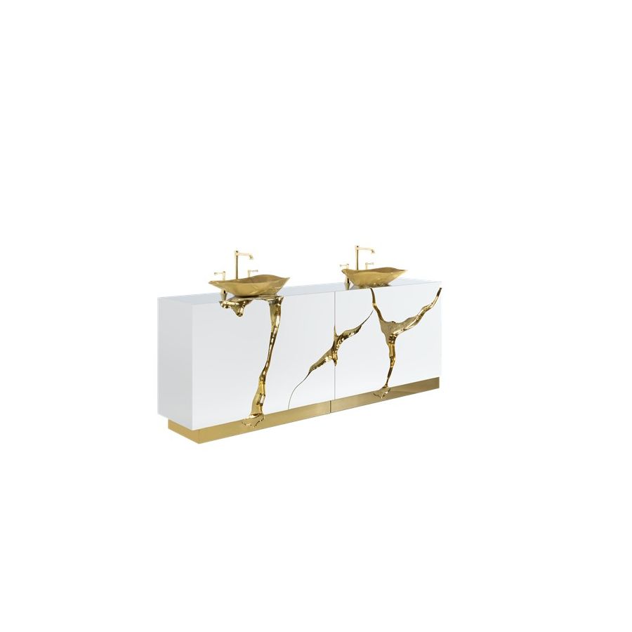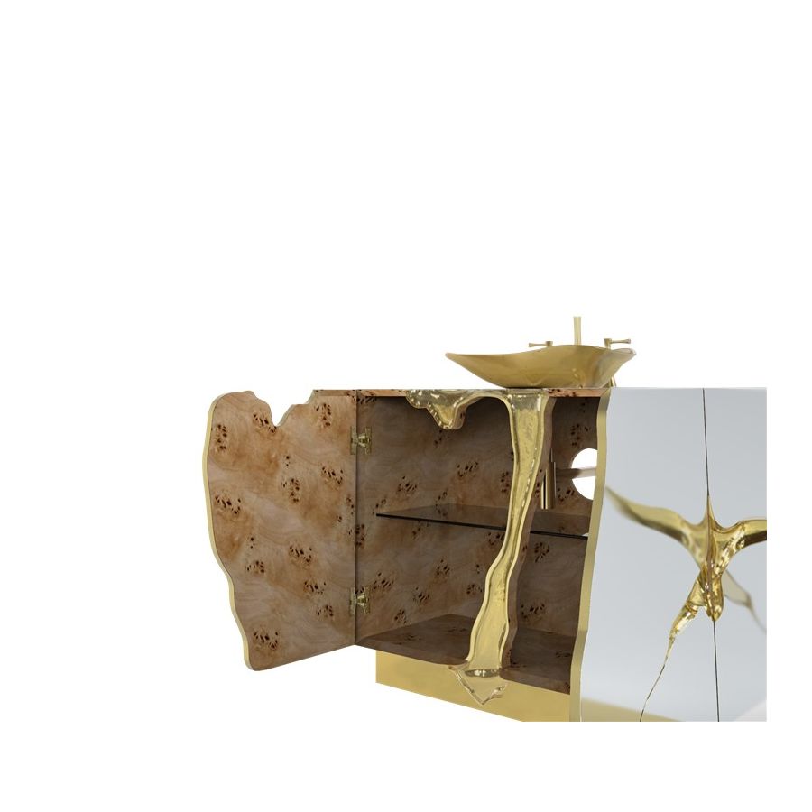 Lapiaz was inspired by the typical karst formations produced by the dissolution of limestone rocks. With a polished brass tear enhanced by its rich aesthetic as well as a set of four doors finished in poplar root veneer, this Lapiaz Vanity Cabinet is such a statement that stands out in your bathroom interior design!