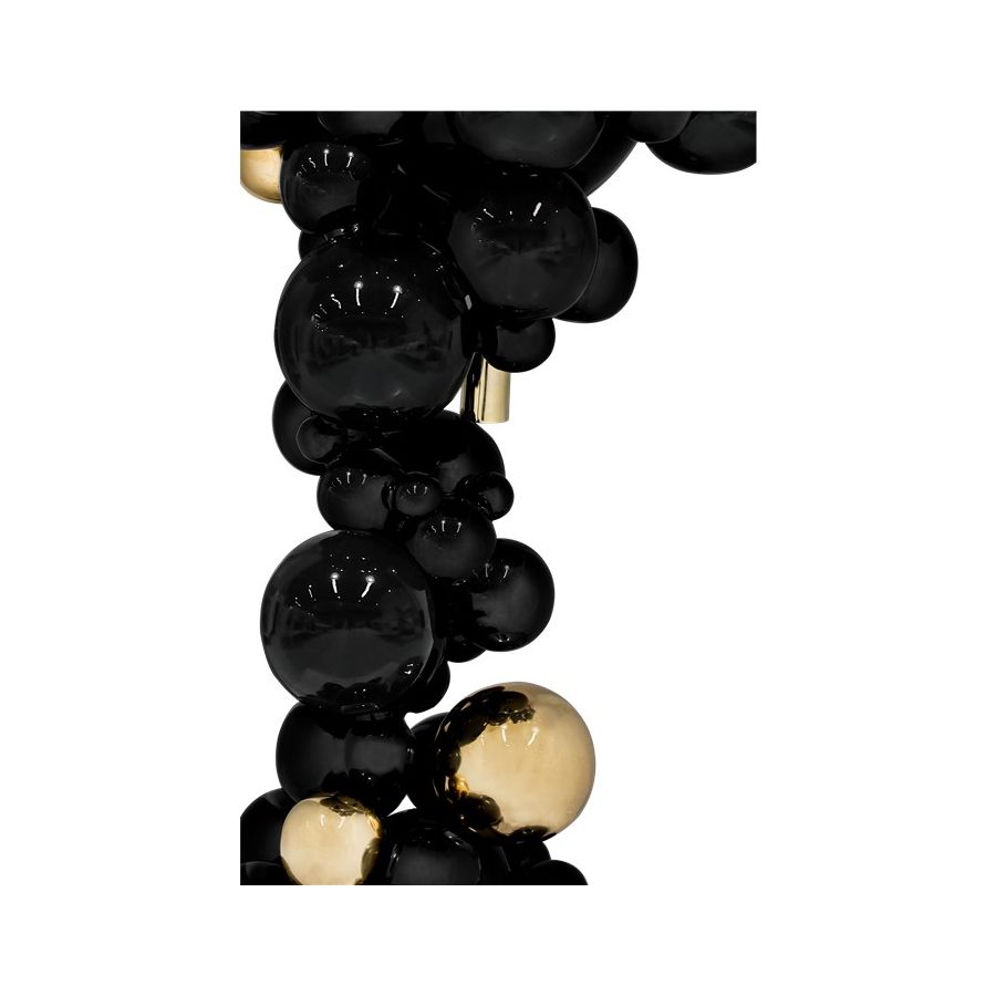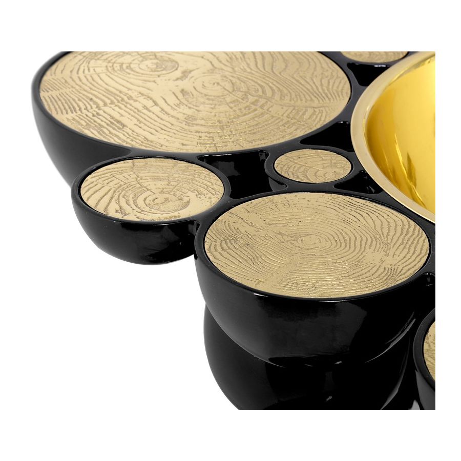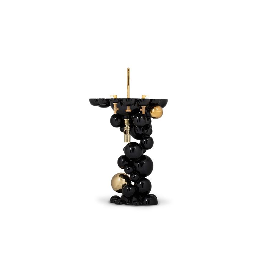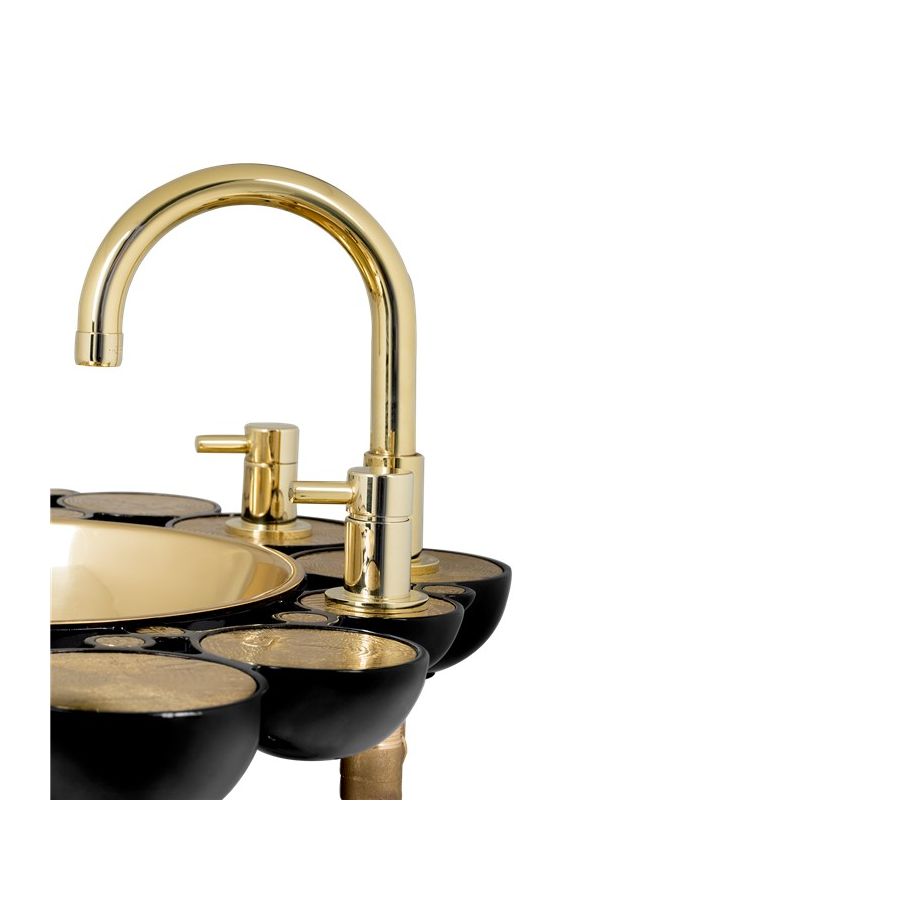 Structure: Casted aluminum, High gloss black lacquered | Polished Brass spheres, High gloss varnish; Top: Casted brass, High gloss varnish; Sink: Polished brass, High gloss varnish; Water drainage: Wall