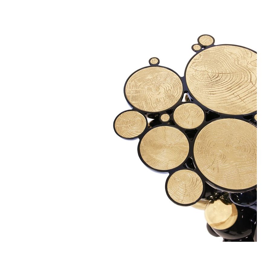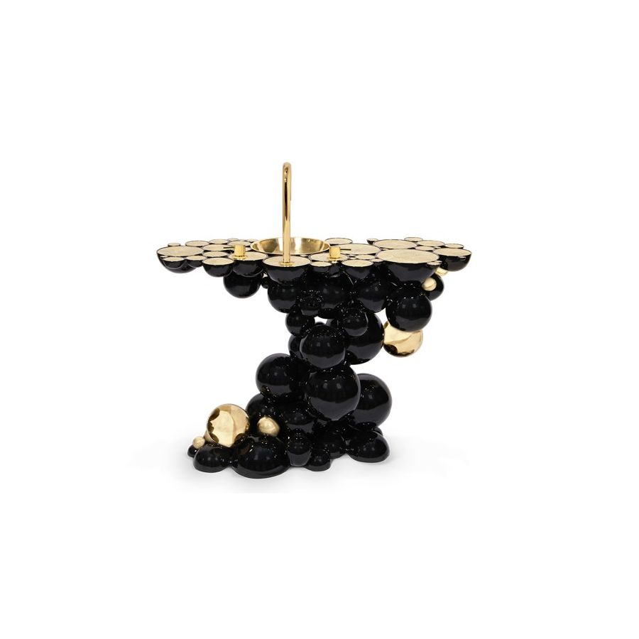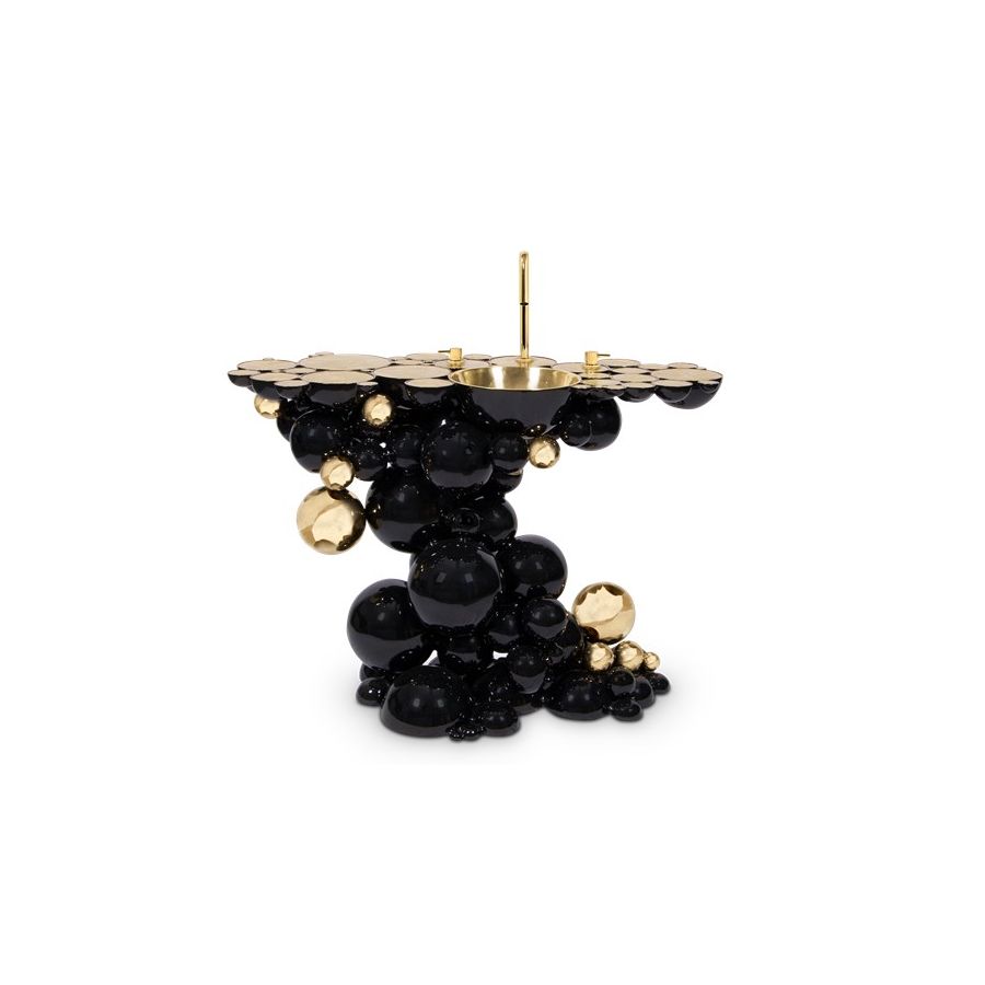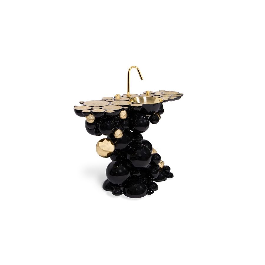 Structure: Casted aluminum, High gloss black lacquered | Polished Brass spheres, High gloss varnish; Top: Casted brass, High gloss varnish; Sink: Polished brass, High gloss varnish; Water drainage: Wall
