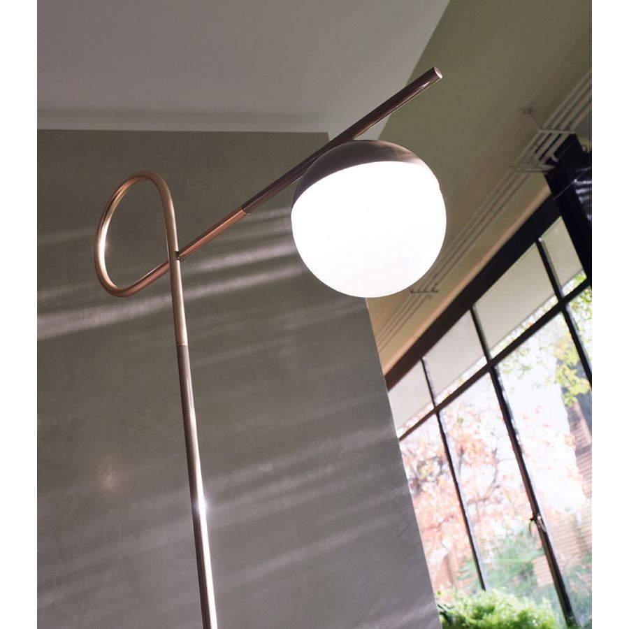 Simple and essential design represented by the metal structure, slender and fine embellished with a knot at its end. The light source is a milk-colored blown glass sphere. The two-tone metal structure, one part chromed and the other painted, is an expression of elegance and luxury. Its simple and clean shapes make it a modern object suitable for all types of environments.