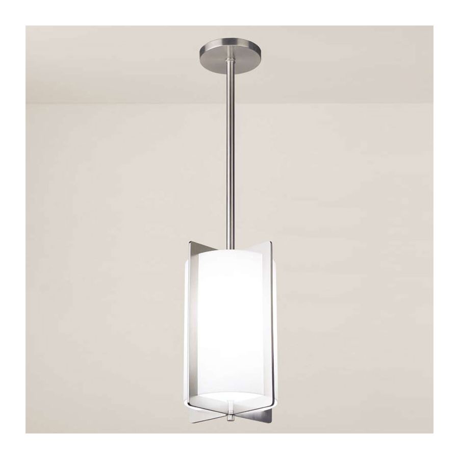 A crisp, white cylindrical diffuser is supported by crisscrossing bands of solid brass to give this lantern a light but substantial feel.
