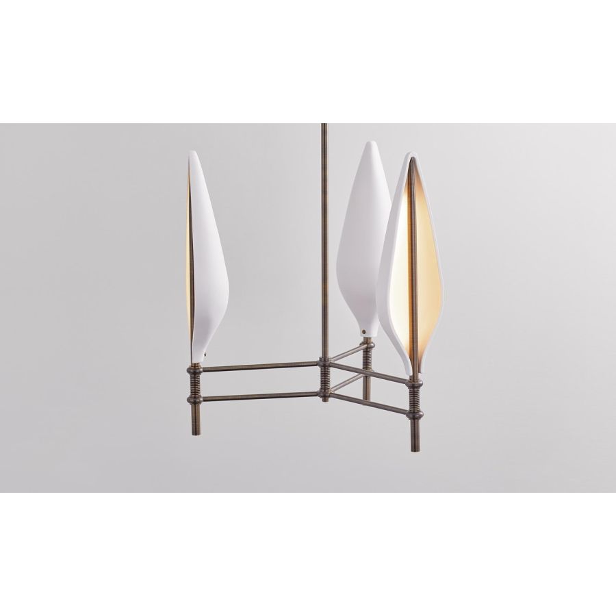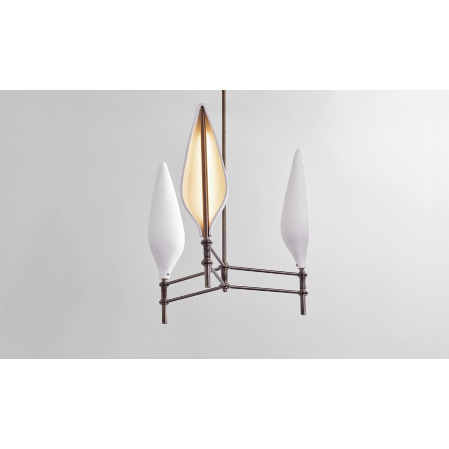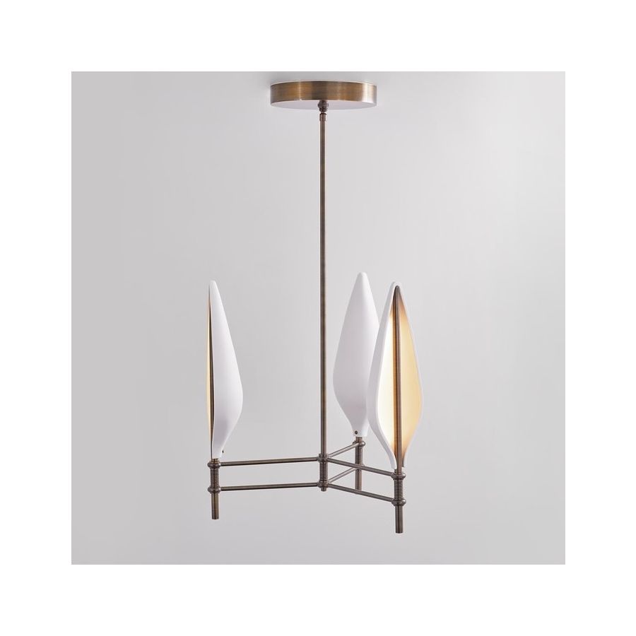 Architectural details inspired the Spire Pendant, which features three cast porcelain shades, each illuminated from within turned brass rods to create a sculptural statement piece. Designed by Jake Oliveira.