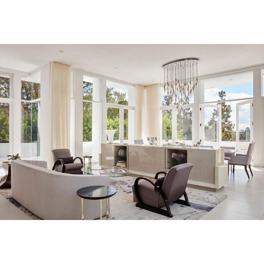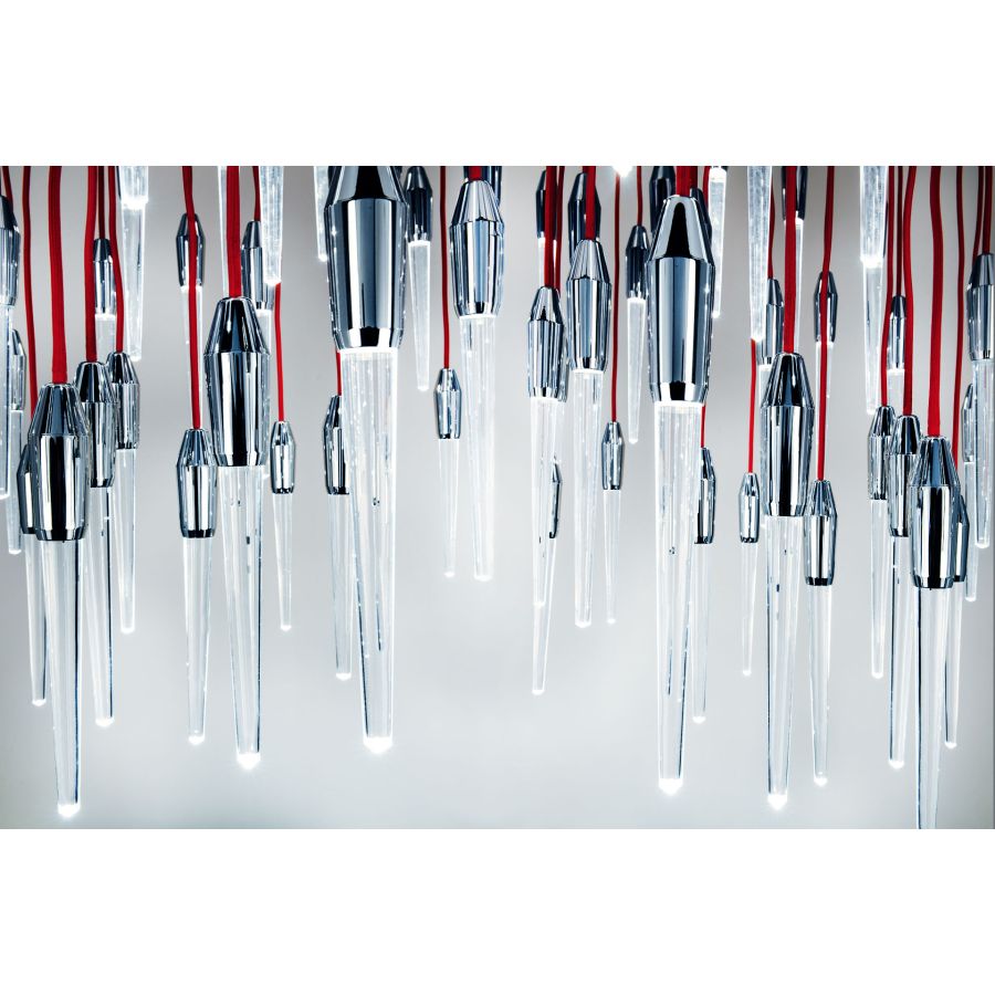 A modern take on the chandelier, this LED flush mount ceiling fixture designed by architect Tom Nahabedian features an arresting shower of Icicles. Nominated for a Best of Year award from Interior Design and perfect for big drama, it comes in two sizes, six metal finish options, and six cord color options, and can be configured in any combination of sparkling clear glass or soft etched glass.