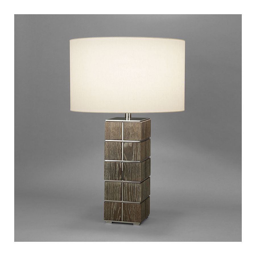 Cubes of cerused oak are stacked and separated by hand-finished brass spacers. This transitional and modern table lamp is substantial in size, weight and stature, suitable for anchoring rooms in residential, hospitality and commercial spaces.