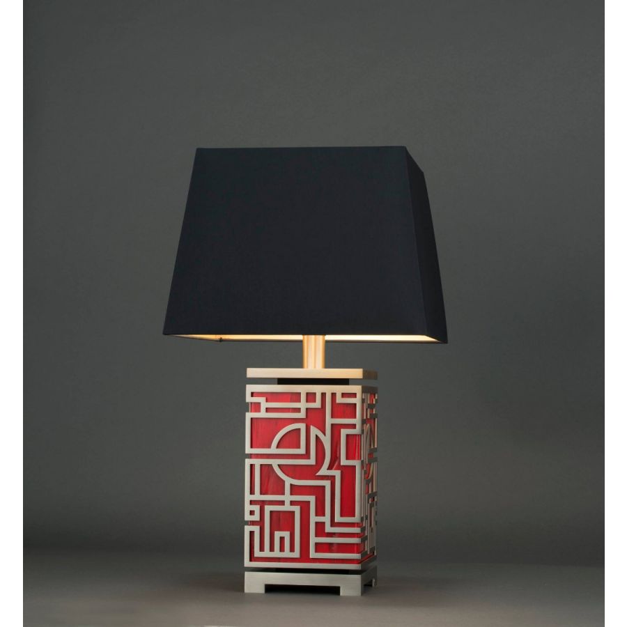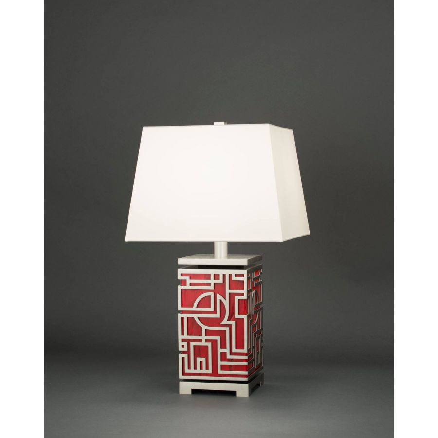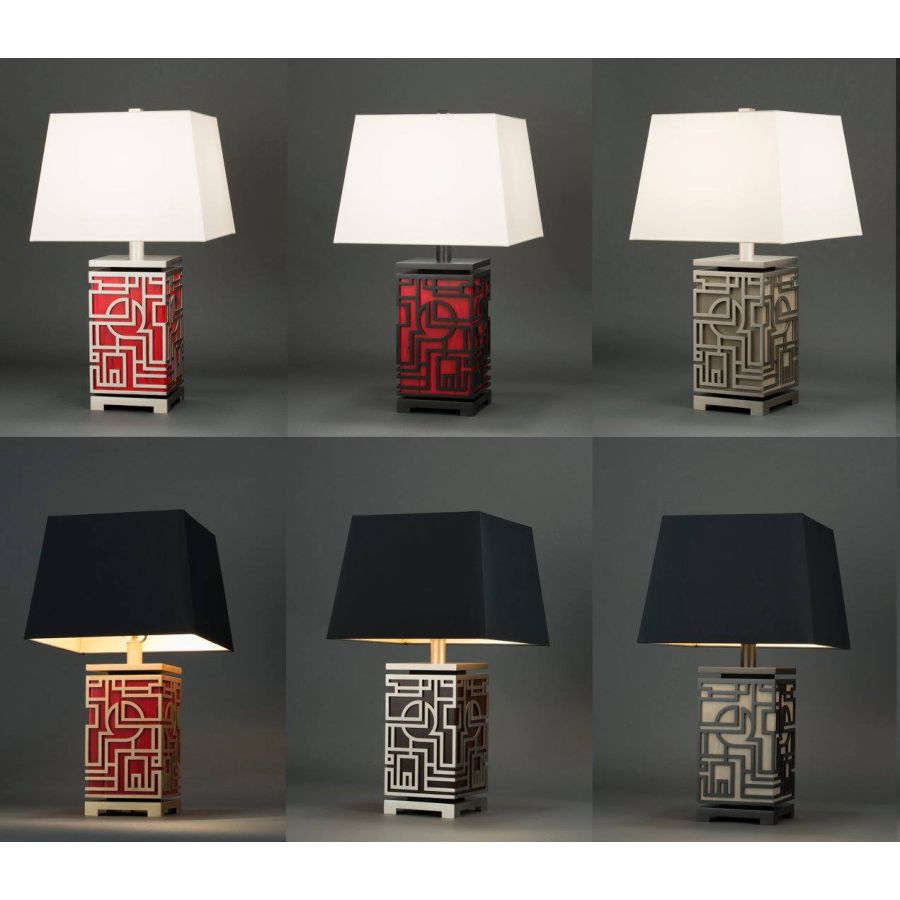 A modern interpretation of Chinoiserie meets Old Hollywood glamour available in five metal finish options and wood base options of Grey Cerused Oak, Dark Walnut or Imperial Red.