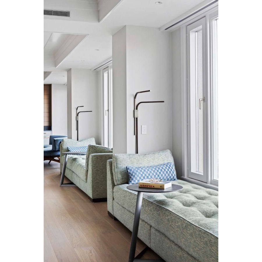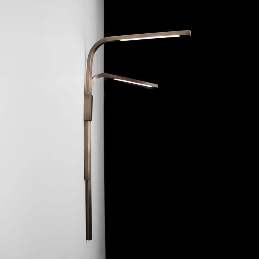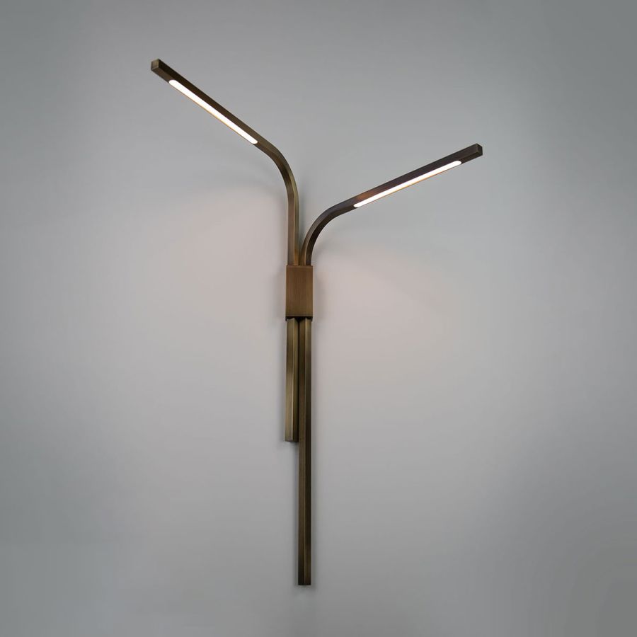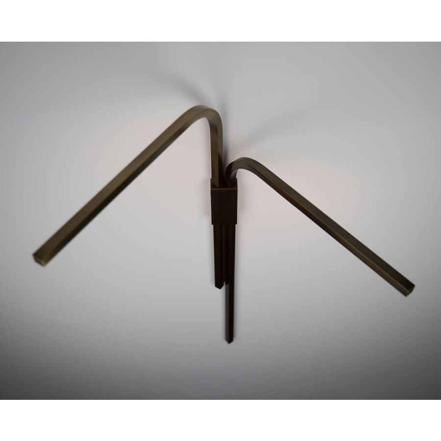 Square tubes of hand-finished brass rotate for multi-directional illumination which glows from behind silicon white diffusers. The top arm rotates 180° and the lower arm rotates 90° to ensure they do not interfere with each other.