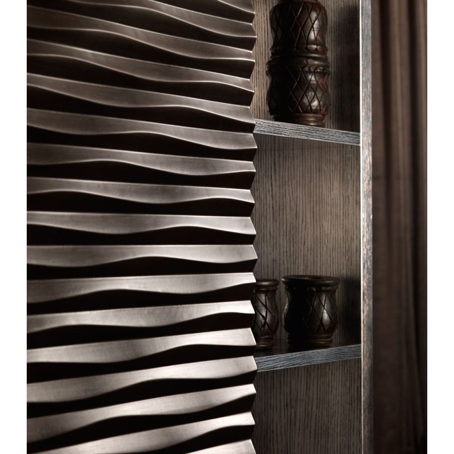 Modern-zeitgenössische Kommode und Nachttisch, realisiert mit einem edlen, aus Holz geschnitzten Wellendesign und integrierter Glasplatte. Ebon ist ein isoliertes Atoll im Ozean, das wie die Oberfläche dieser Kollektion mit wellenförmigen Sandstränden übersät ist: eine perfekte Balance aus Technik und Schönheit. Reine Formen, perfekte Linien, vorbildliche „Gegenstände“, die für unser tägliches Leben nützlich, aber auch notwendig sind, um unser Leben schön zu machen. Das Bücherregal weist das Wellendekor an der Tür auf. Der obere Teil ist offen und dient als offenes Fach.