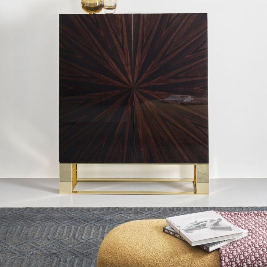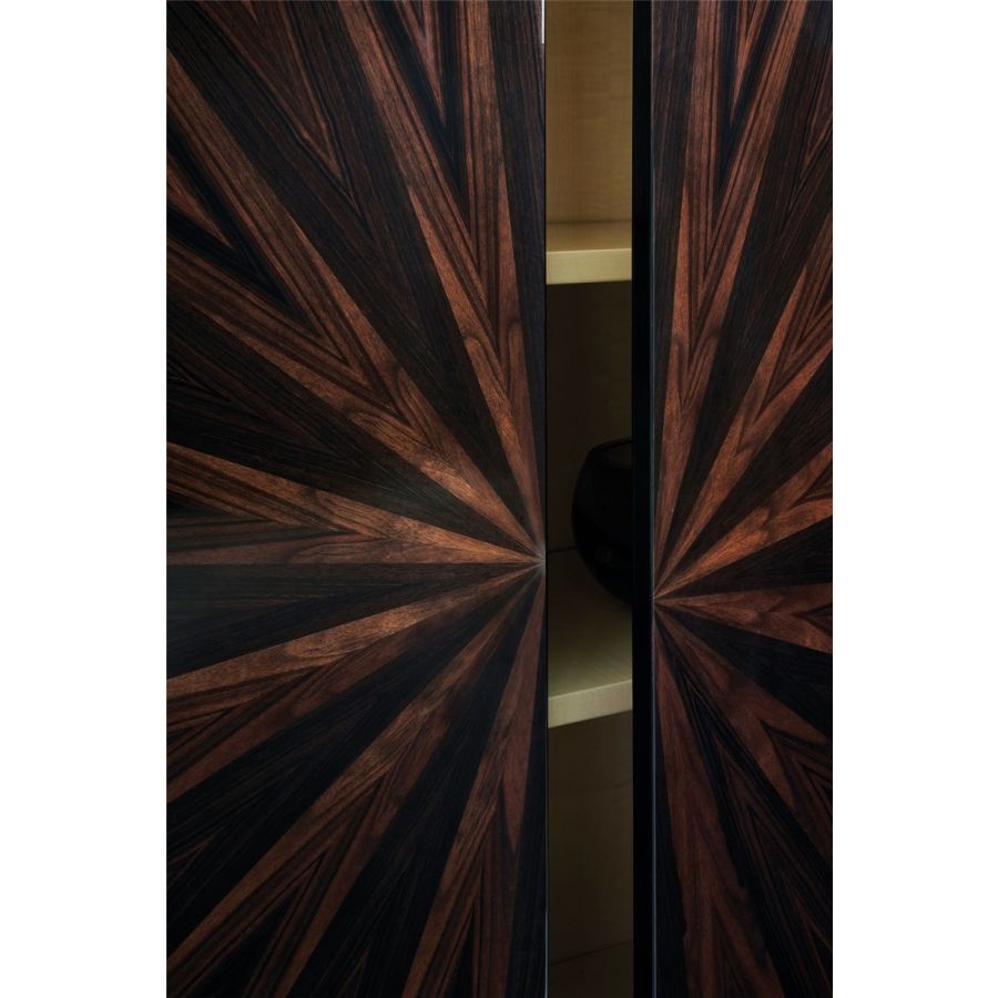 Fylld av överdåd och Art Deco-inspirerad stil är Gerard-skåpet ett dyrbart föremål tillverkat i trä med ett praktfullt, strålfördelat Makassar-ebenholtsfanér.