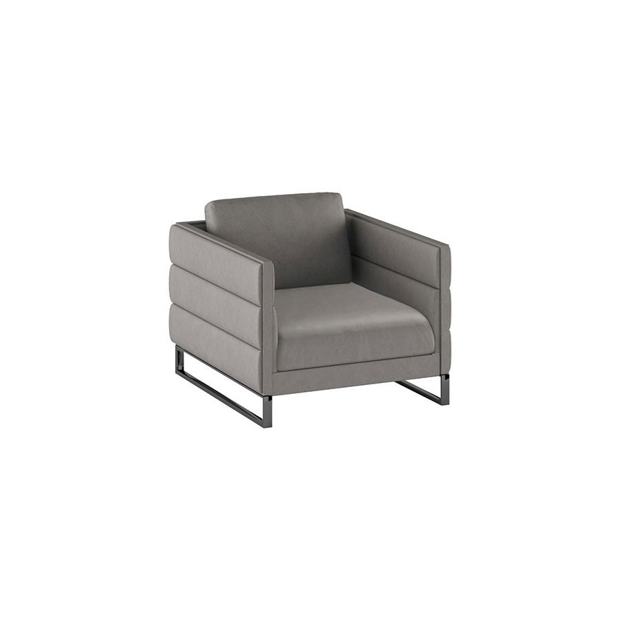 Firmly upholstered armchair, back and seat cushions with removable upholstery, 2 rectangular cushions, edges and base made of steel.