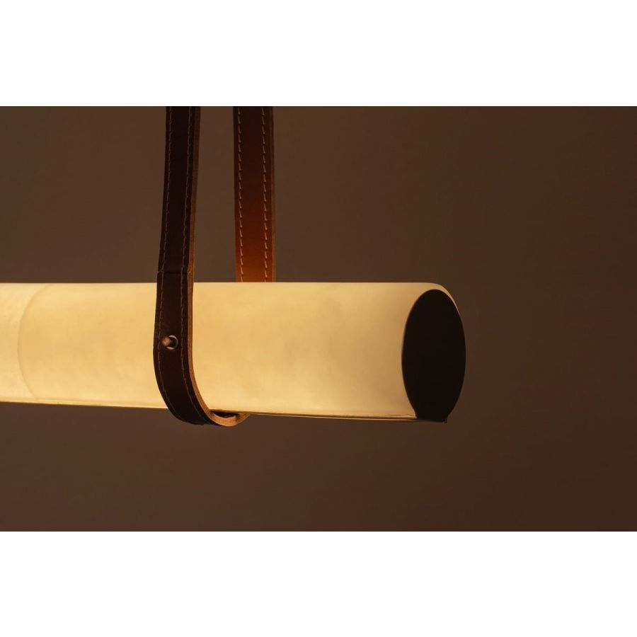 Crafted from alabaster and suspended with leather straps, The Line brings warmth, texture, and sophistication to any interior. Made with noble materials and a design refined down to the smallest detail, it transforms the atmosphere with a light that conveys elegance and timeless balance.