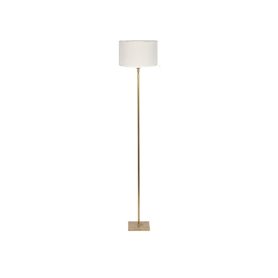 Floor lamp in brass. Made with a round tube on a square base. This sober and elegant floor lamp remains discrete in your interior. Available in black or matt gold patina, and in nickel or brushed nickel. Also exists in small size (LD12). Presented lamp shade in white cotton chintz in a conical shape (see other available shapes and colours).