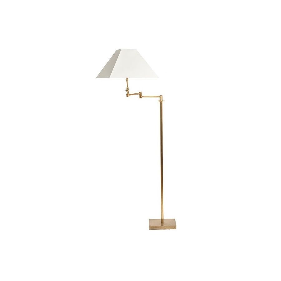 Floor lamp in brass. Made with a round tube with a swing arm, on a square base. This contemporary floor lamp gives a deported lighting thanks to its swing arm. Available in black or matt gold patina. Presented lamp shade in white cotton chintz in a tall square shape (see other available shapes and colours).
