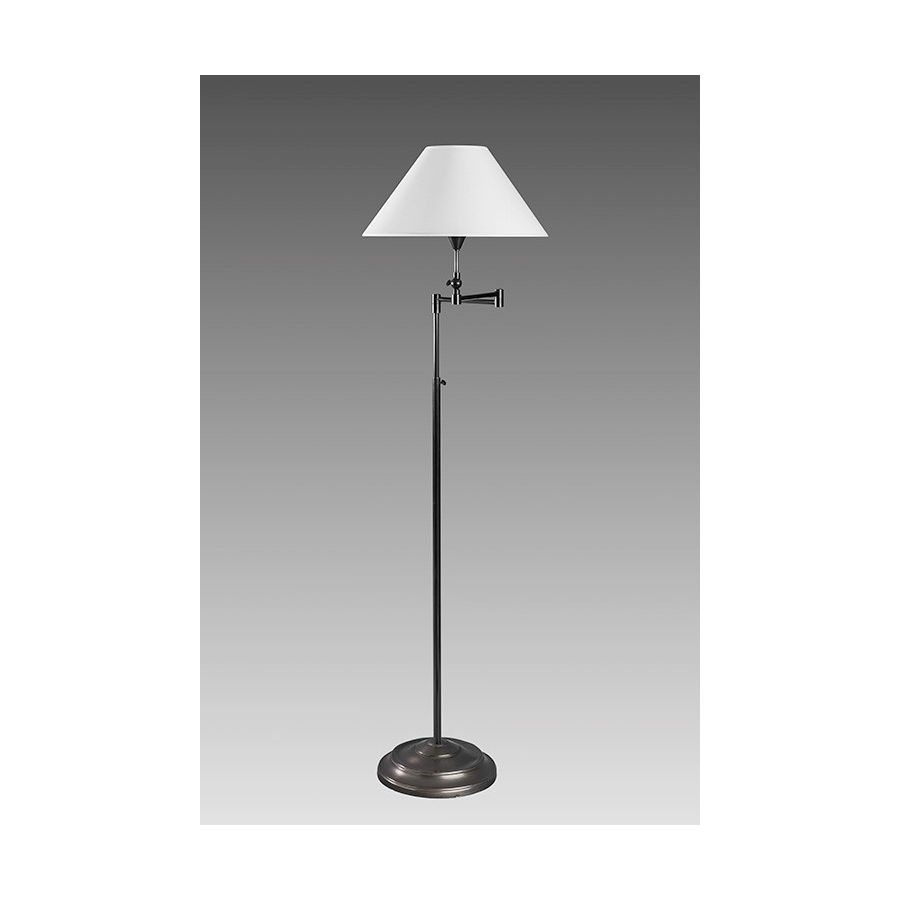 Floor lamp in brass. Made with a ajustable round tube with a swing arm, on a round base. This classical floor lamp gives a deported lighting thanks to its adjustable tube and its swing arm. Available in black or matt gold patina. Presented lamp shade in white cotton chintz in a conical shape (see other available shapes and colours).