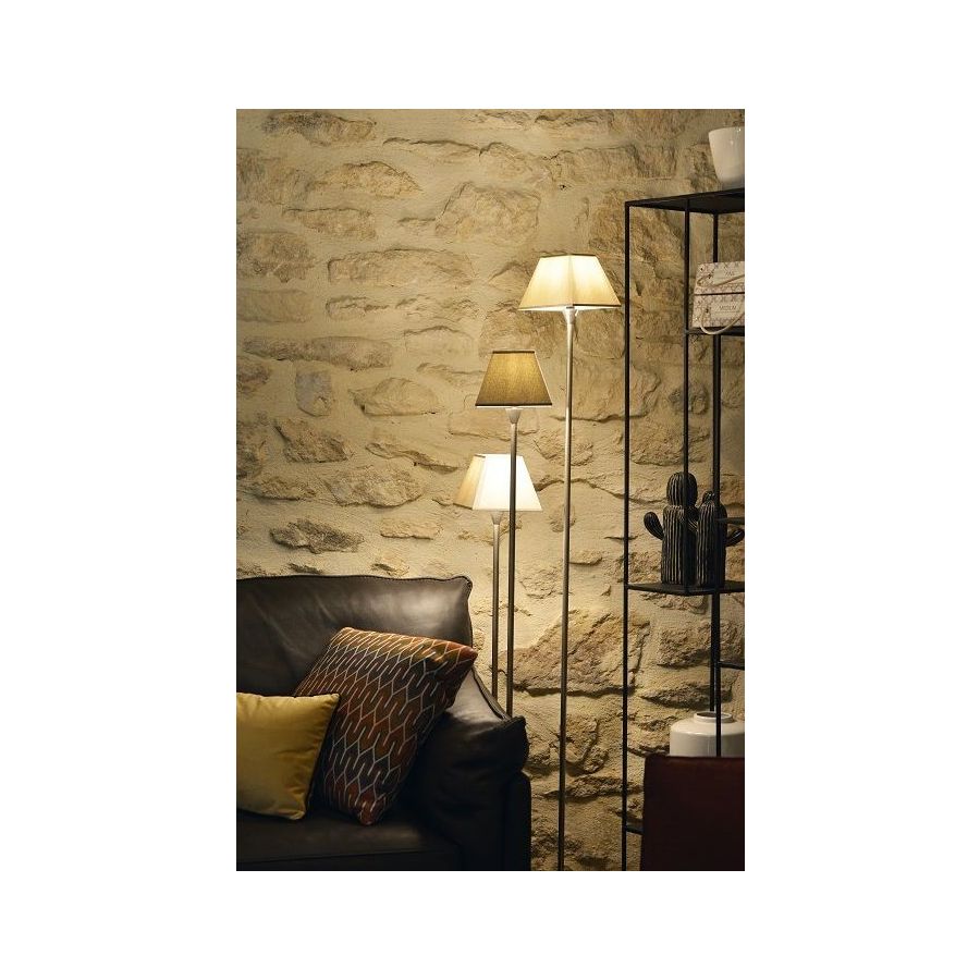 Floor lamp in brass. Made with 3 round tubes of various height on a square base. This contemporary floor lamp gives an original touch to your interior. Available in black or matt gold patina, and in brushed nickel. Presented lamp shade in white cotton chintz in a conical shape (see other available shapes and colours).