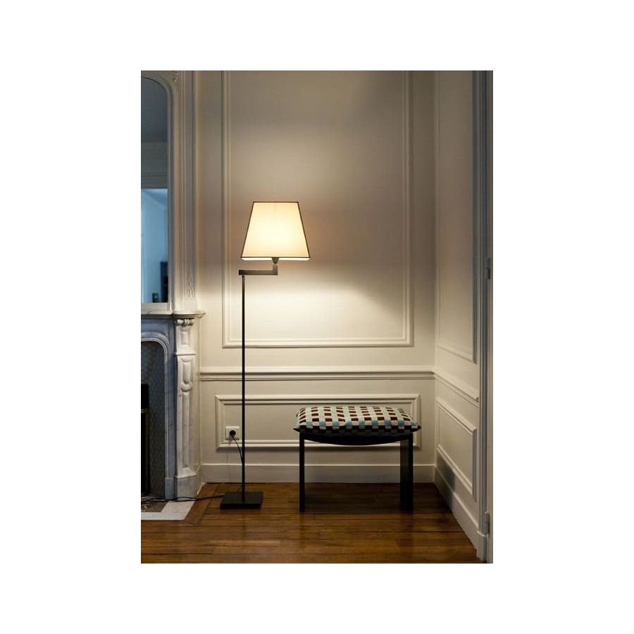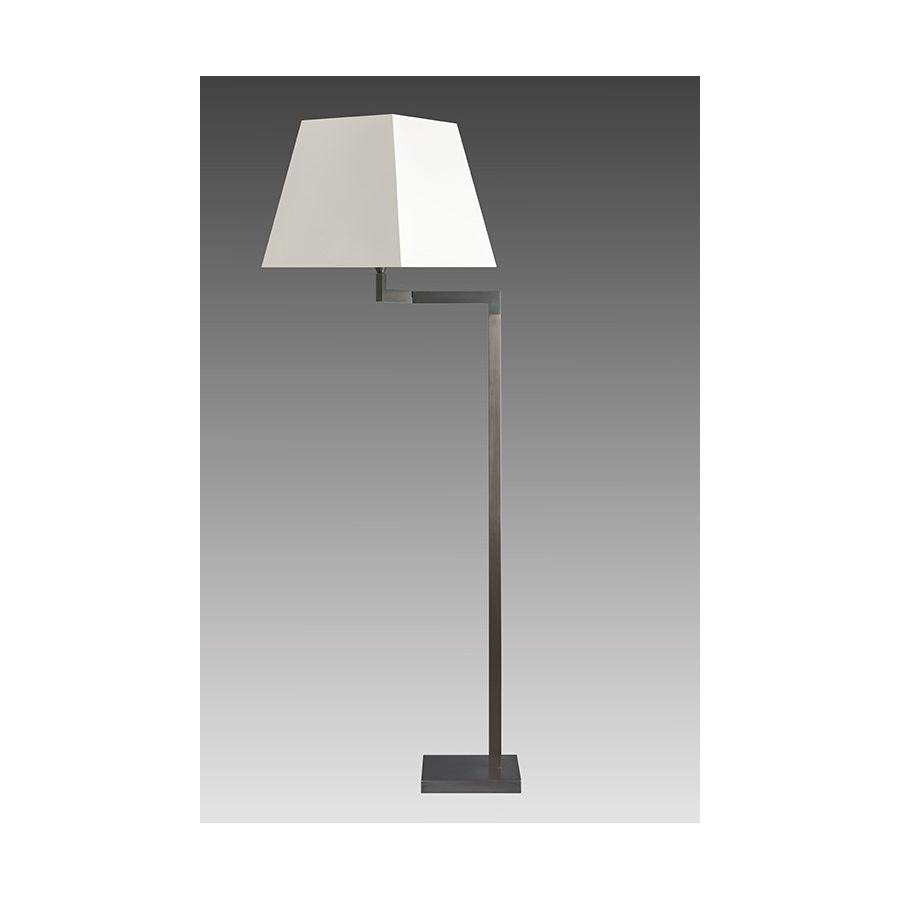Floor lamp in brass. Made with a rectangular tube with a swing arm, on a square base. This contemporary floor lamp gives a changing lighting thanks to its swing arm. Available in black patina. Presented lamp shade in white cotton chintz in a pyramidal tapered shape (see other available shapes and colours).