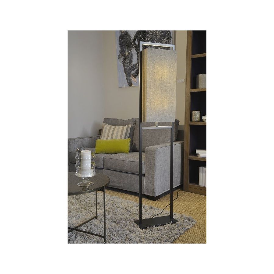 Floor lamp in brass. Made with a double rectangular frame on a square base, the lamp shade is inserted in the upper frame. This contemporary floor lamp gives a original design to your interior. Available in black patina. Presented lamp shade in white cotton chintz in a rectangular shape (see other available shapes and colours).