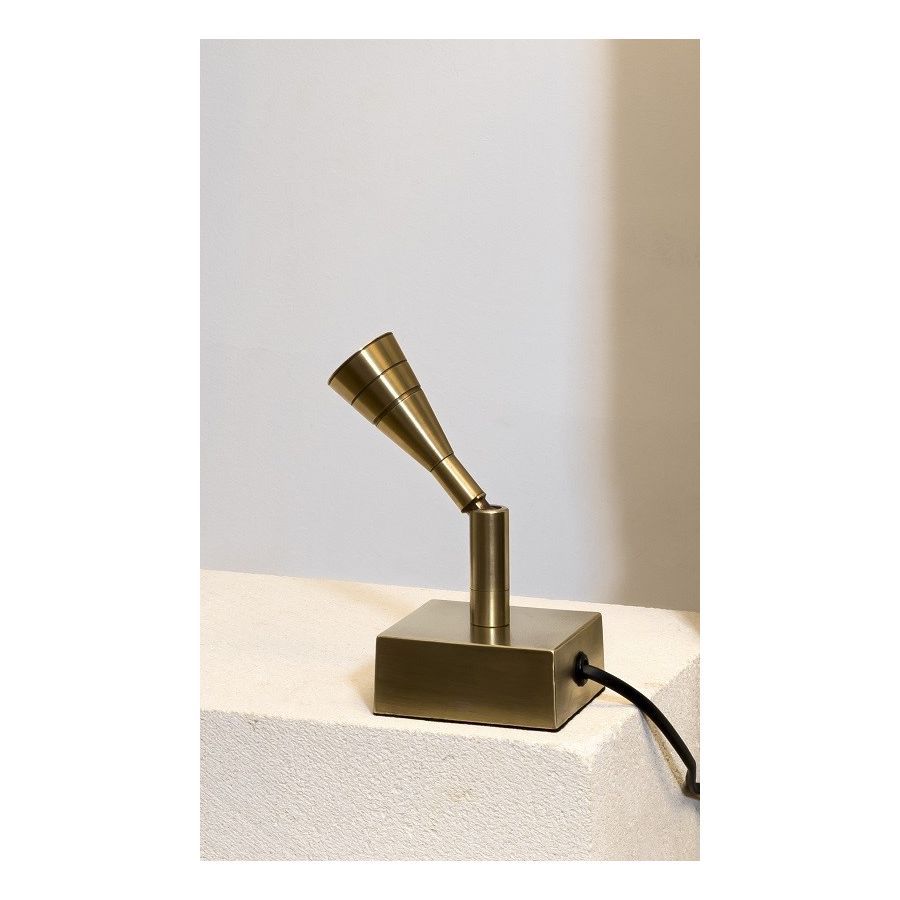 Table spot made in brass It is made with a conic led light on a square base This table spot with a sober and elegant design highlights a painting, a sculpture, a furniture Available in black or matt gold patina.