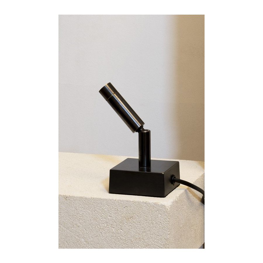 Table spot made in brass It is made with a cylindrical led light on a square base This table spot with a sober and elegant design highlights a painting, a sculpture, a furniture Available in black or matt gold patina.