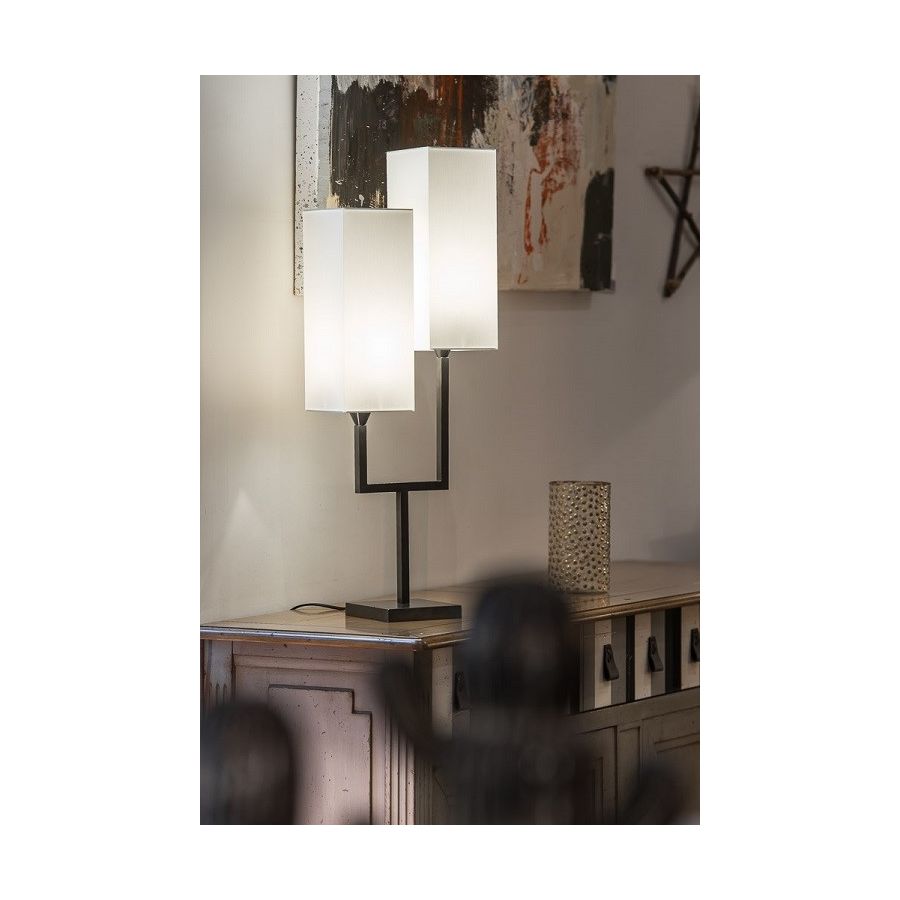 Lamp made in brass. Made with a square tube as a double torch on a square base. This contemporary lamp gives an elegant design to your interior. Available in black or matt gold patina. Presented lamp shade in white cotton chintz in rectangular shape (see other available shapes and colours).