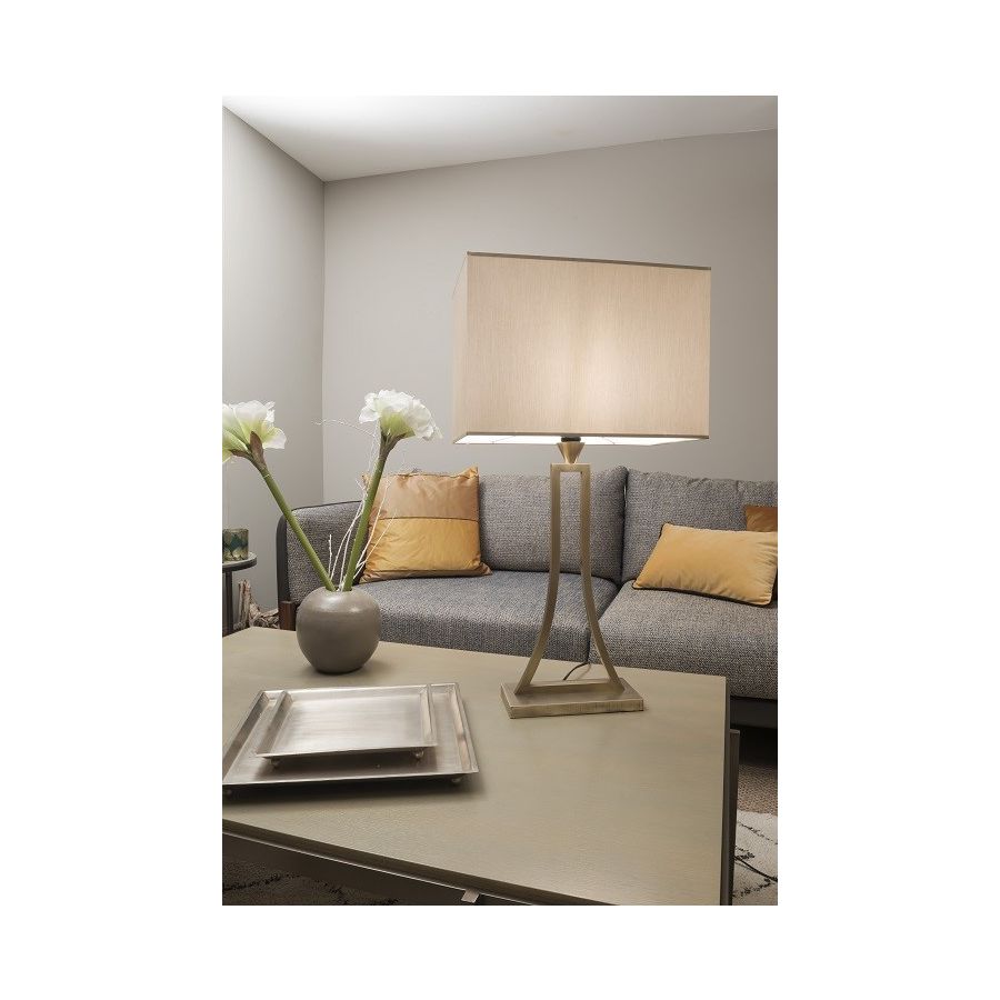 Lamp made in brass It is made with two square tubes forming harmonious curbs on a rectangular base This table lamp with an elegant design nicely decorates a living room, a bedroom or an office Available in black or matt gold patina Presented cylindrical shade in white cream chintz (see other available shapes and colors).