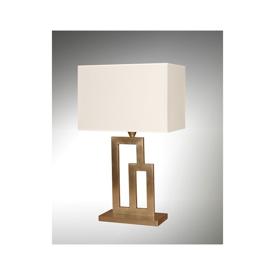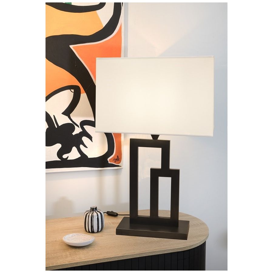 Lamp made in brass. Made with two large rectangular frames, on a square base. This contemporary art deco lamp gives an original design to your interior. Available in black and matt gold patina. Also exists in larger size (L210B). Presented lamp shade in white cotton chintz in a rectangular shape (see other available colours).