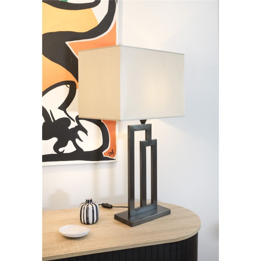 Lamp made in brass. Made with two large rectangular frames, on a square base. This contemporary art deco lamp gives a original design to your interior. Available in black and matt gold patina. Also exists in smaller size (L210A). Presented lamp shade in white cotton chintz in a rectangular shape (see other available colours).