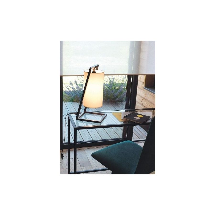 Lamp in brass. This model has been created by designer Sandra Hellmann ©. Made with a inclined rectangular frame on a square frame. This contemporary lamp gives a original design to your interior. Available in black patina. Presented lamp shade in white cotton chintz in a cylindrical shape (see other available shapes and colours).