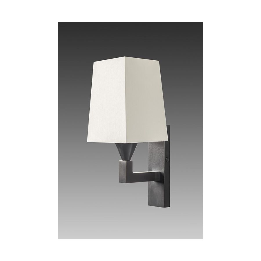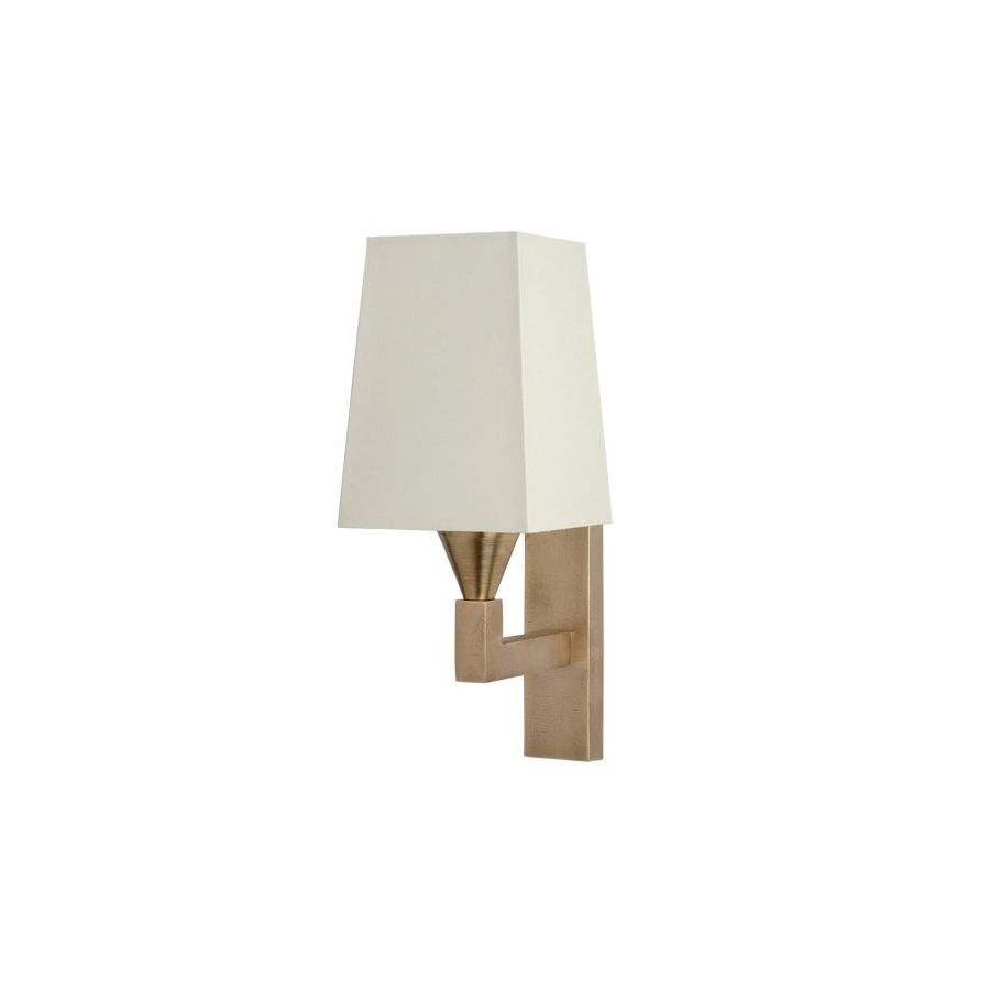 Wall light made in brass. Made with a fixed arm on a thin rectangular base. This simple and elegant wall light discretely fits into your interior. Available in black or matt gold patina, and in nickel or brushed nickel. Presented lamp shade in white cotton chintz in a tapered rectangular shape (see other available shapes and colours).