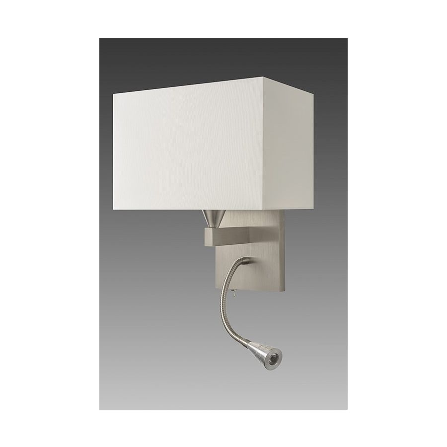 Wall light with Led light made in brass. Made with a fixed arm on a rectangular base and a Led light, on a 20cm flex with switch. This elegant wall light gives an ambiance or direct light. Possibility of a second switch on demand. Available in black or matt gold patina, and in nickel or brushed nickel. Presented lamp shade in white cotton chintz in a rectangular shape (see other available shapes and colours).