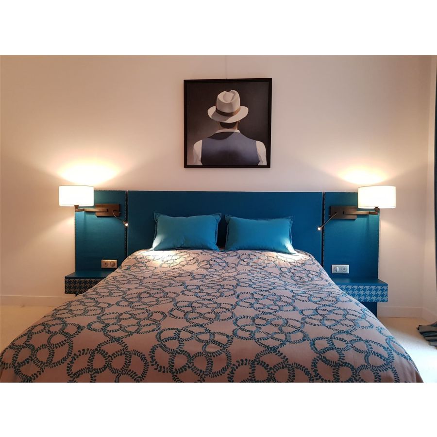 Wall light with Led light made in brass. Made with a curved fixed arm on a wide rectangular base and a Led light, on a 30cm flex with switch. This elegant wall light next to bed gives an ambiance or direct light. Possibility of a second switch on demand. Available in black patina. Presented lamp shade in white cotton chintz in a round shape (see other available shapes and colours).