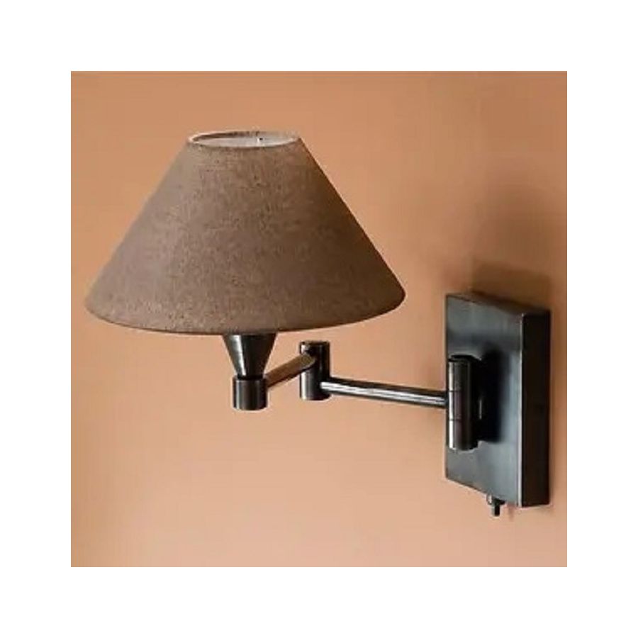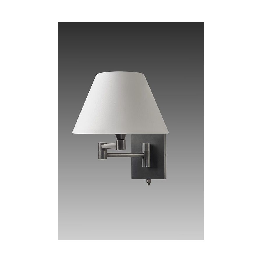 Wall light made in brass. Made with a double swing arm on a rectangular base with switch. This classical wall light gives a nice light next to bed. Available in black or matt gold patina, and in nickel or brushed nickel. Presented lamp shade in white cotton chintz in a conical shape (see other available shapes and colours).